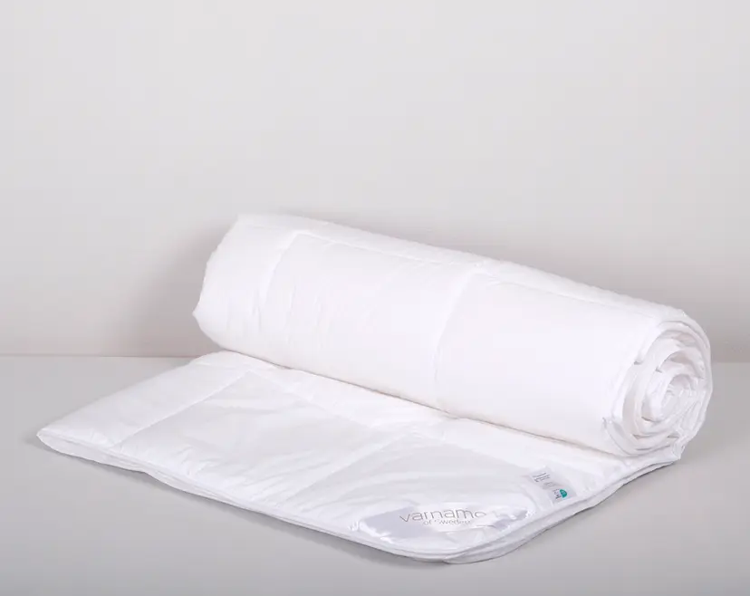 Täcket Gullviva är gjort av ett tyg som är i 100% ekologisk bomullspercale. Stoppat med silikoniserad Softfilling fiber - certifierad återvunnen polyesterhålfiber av högsta kvalitet. Egenskaperna från polyesterhålfibern ger täcket bra isoleringsförmåga och livslängd. Täcket är rutstickat och sydd med en vit bandkant.