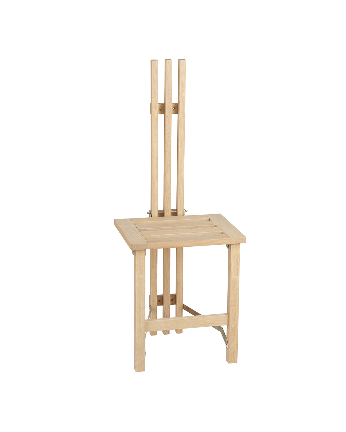 Nadja Väggstol är tillverkad i massiv ek och i vitlackad massiv björk, beslag i slipat stål. Väggstolen blir endast 9 cm hopfälld.