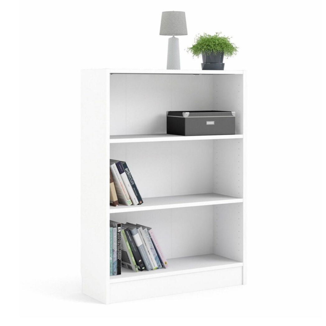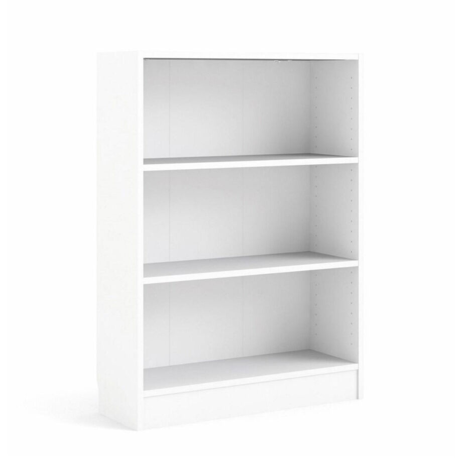 Basic är en enkel bokhylla i melamin. Finns i flera utföranden. Här i vit melamin, 80 cm bredd och höjd 107,2 cm. Två justerbara hyllplan ingår, fler kan köpas till. Varje hyllplan klarar 13 kg vikt.