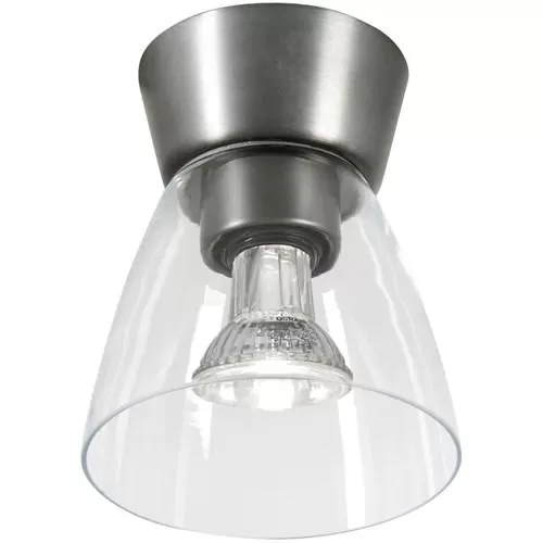 Snygga och diskreta plafonden Bizzo, med en klar glaskupa och takfäste i lackad aluminium (oxidgrå). Är även godkänd för badrum. Levereras med en E27 reflektorlampa LED-lampa på 6W som ger en spotlighteffekt nedåt, varmvitt ljus och fullt dimbar.