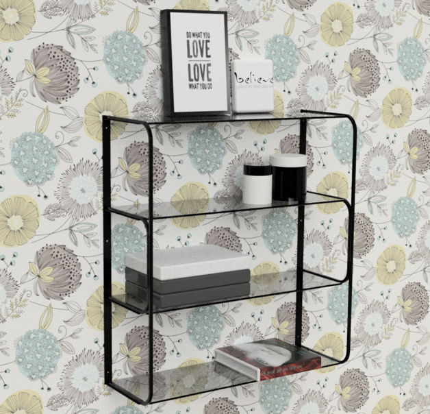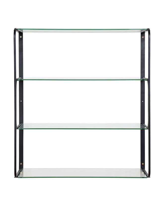 Nätt och stilren vägghylla med sidor i svartlackerad metall och fyra hyllplan i glas. Hyllan Ellen är en kombination av retro och modern och passar fint i de flesta inredningar.