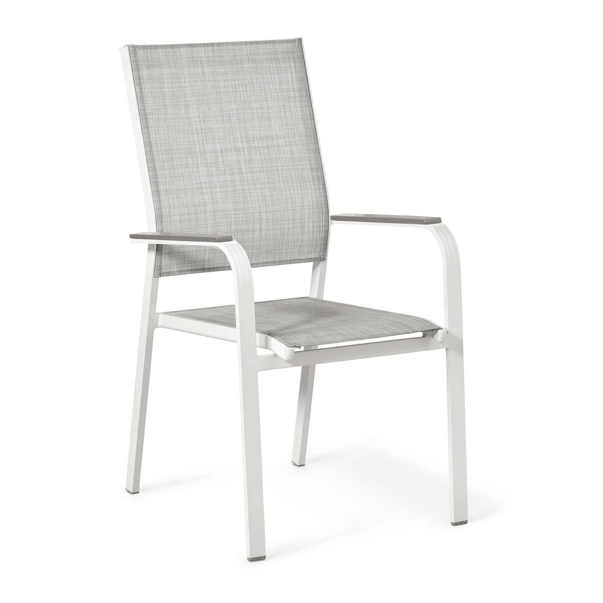 Stapelbar karmstol i vit aluminium med rygg och sits i grå textilene. Snygga detaljer på armledarna i grå nonwood.