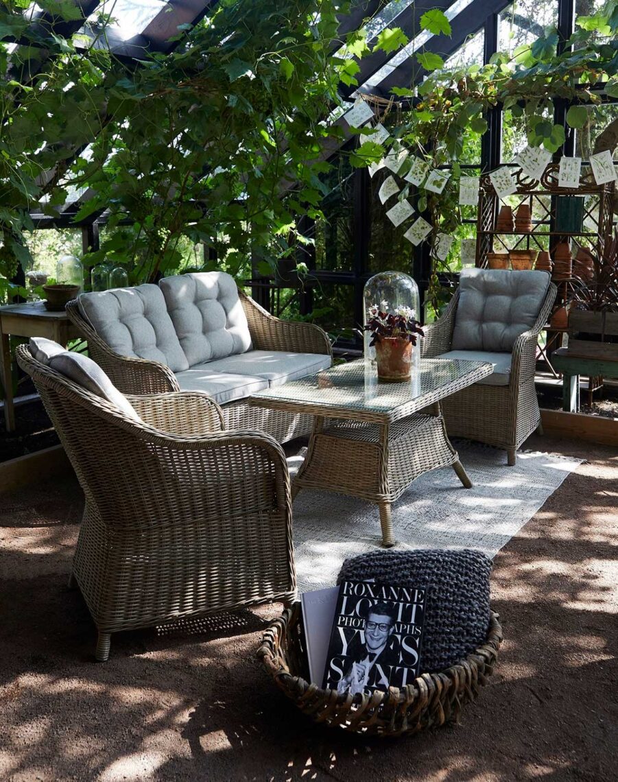 Utegrupp Cannes är en nätt soffgrupp i naturtrogen konstrotting. Konstrottingen är flätad runt en stomme i aluminum, vilket gör Cannes till en tålig möbel. Rejäla dynor i olefintyg ingår. Soffbordet har en glasskiva på toppen och en praktisk underhylla. Färg: Seagrass med dynor i färgen Lin.