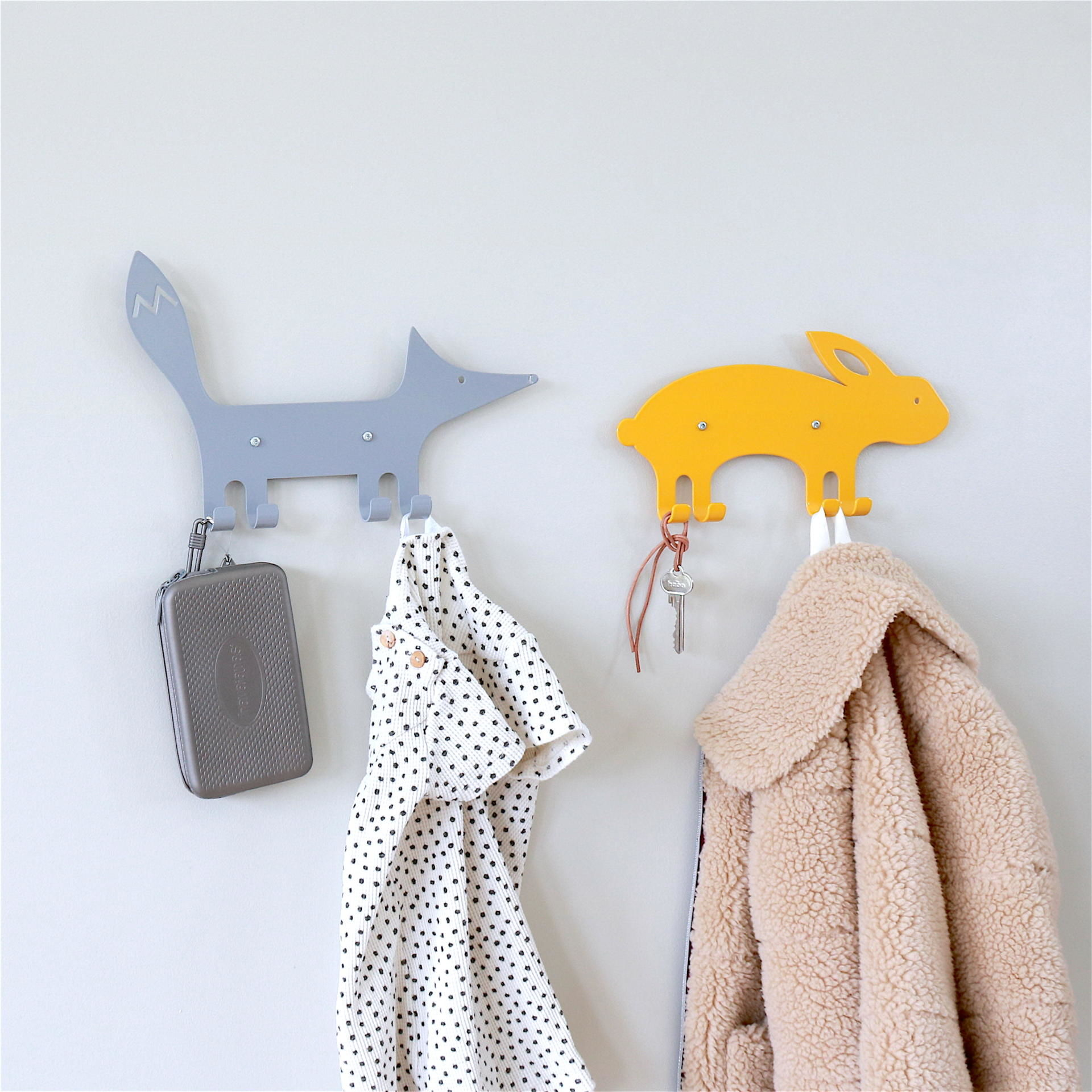 En sofistikerad och lekfull väggkrok i form av en kanin, där kaninens ben blir till krokar. En dekorativ inredningsdetalj i såväl hallen som i barnrummet. Svensktillverkad i pulverlackerat stål. Levereras med skruvar och distanser. Distanserna ger en fin och effektfull skugga på väggen.