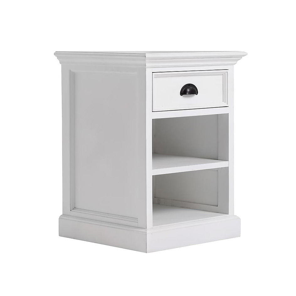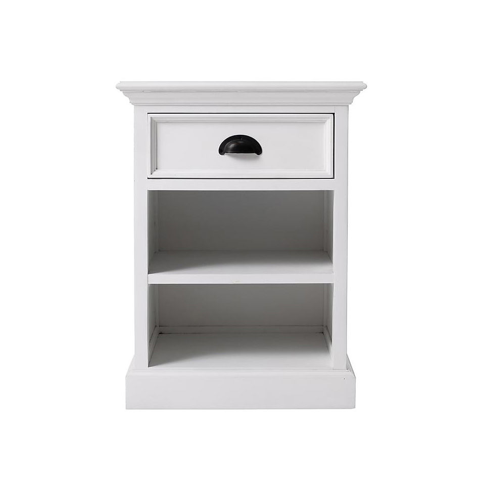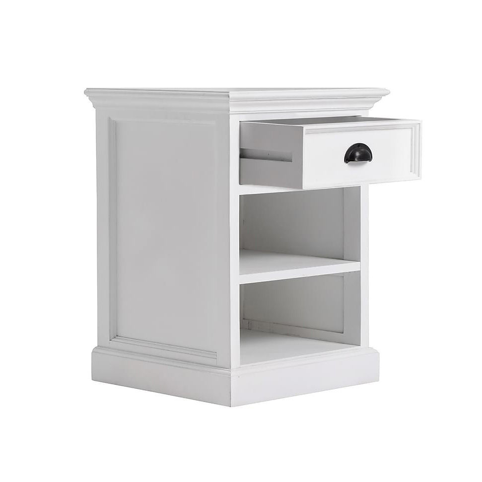 Stilfullt sängbord i massivt vitlackat trä med fina detaljer, så som skålade handtag i antik mässing. Förvaring i form av en låda och ett fast hyllplan som ger två fack. Sängbordets klassiska stil gör det lättplacerat, det passar in i flera olika miljöer och stilar. Kombinera med övriga produkter ur Halifax serien eller använd som en solitär möbel till befintligt möblemang – lika fin på båda sätt. Sängbordets höjd på 60 cm gör att den passar även lite högre sängar.