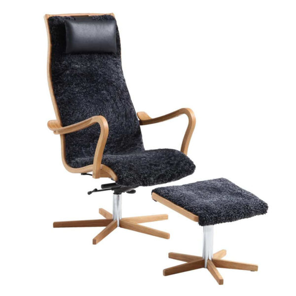 Furiren fårskinnsfåtölj och fotpall från småländska Bröderna Anderssons. Furiren är en nätt och elegant fåtölj med mycket god sittkomfort, i en tidlös svensk design. Fåtöljen har skön snurr- och gungfunktion som enkelt kan låsas i önskat läge. Både fåtöljen och pallen är tillverkade i formpressad oljad ek, klädd i grått fårskinn med en nackkudde i svart skinn. Snurrunderredet är i en nätt design och kombinerar metall/trä på ett smakfullt sätt. Denna modell har extra stoppning mellan fårskinn och linneväv för bästa känslan.