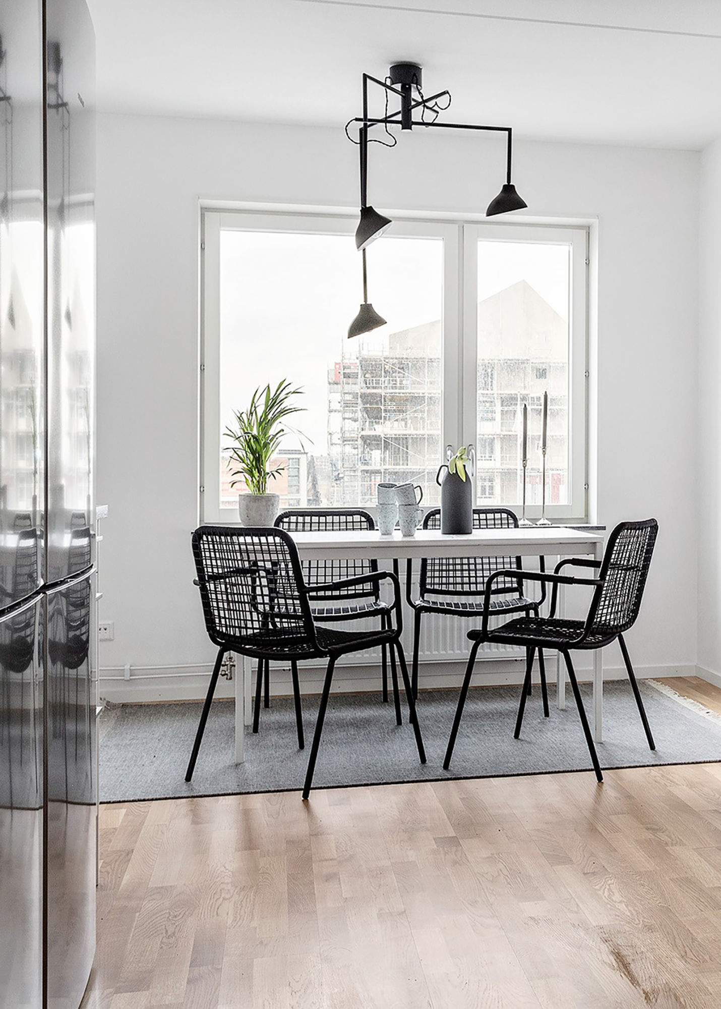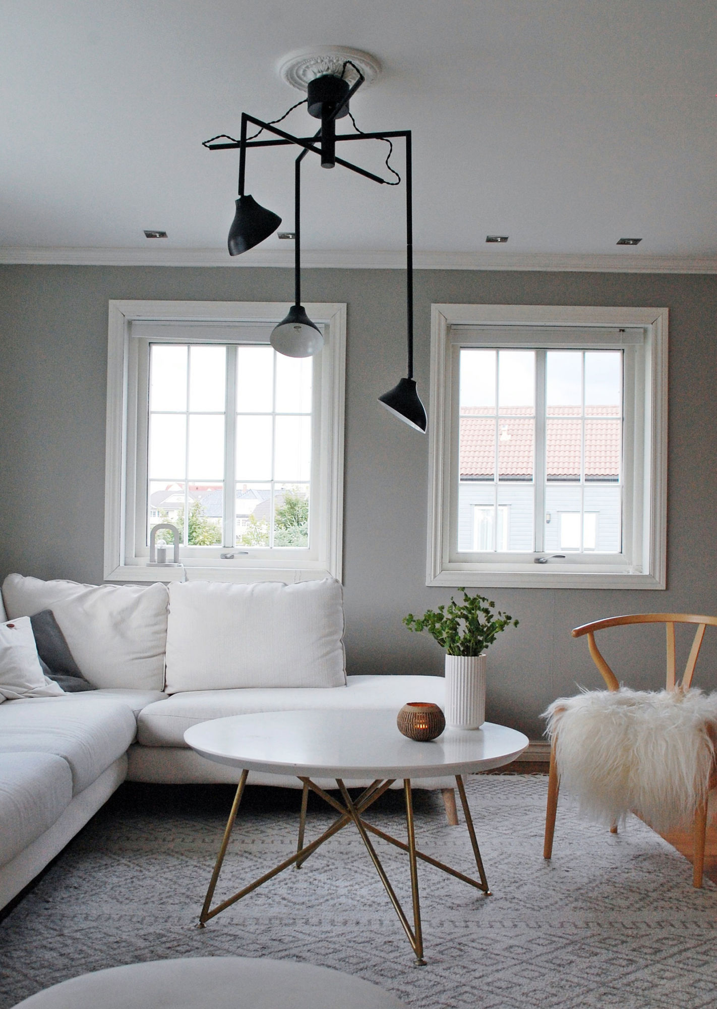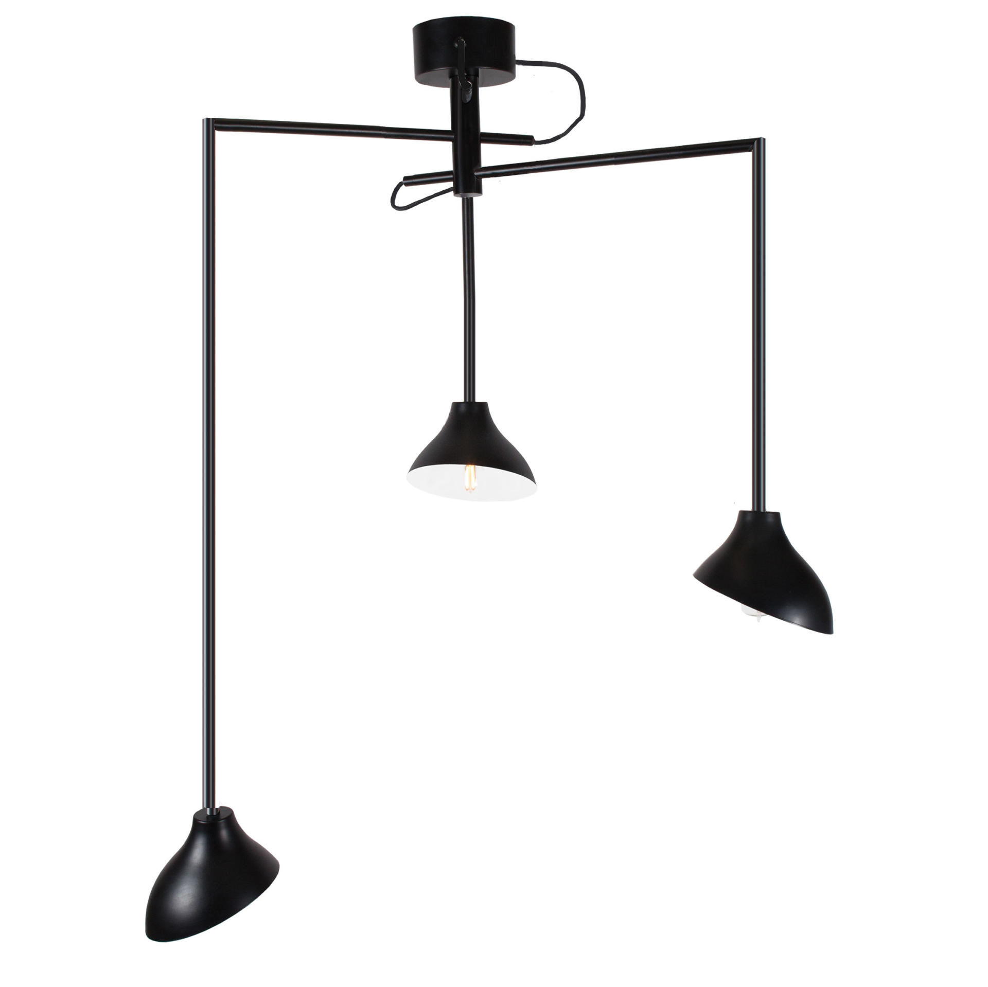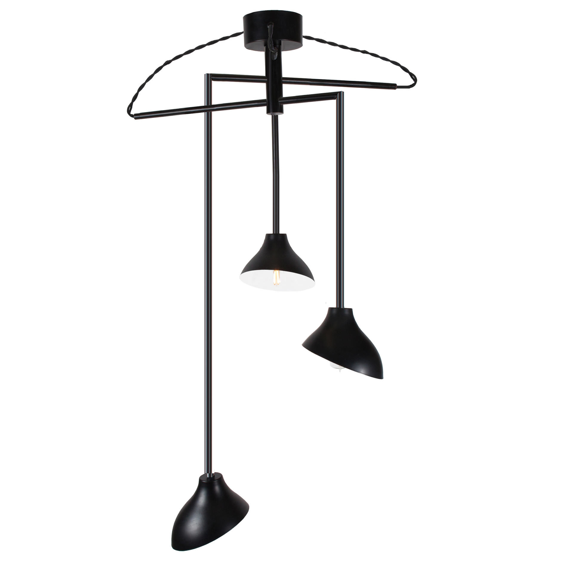 Shift är en stilren och häftig pendel med 3 separata svarta metallskärmar som är justerbara i diameter, från 60 cm till hela 120 cm. Varje kupa är vridbar och har vit insida. Krokupphängning och tvistade svarta textilkablar.