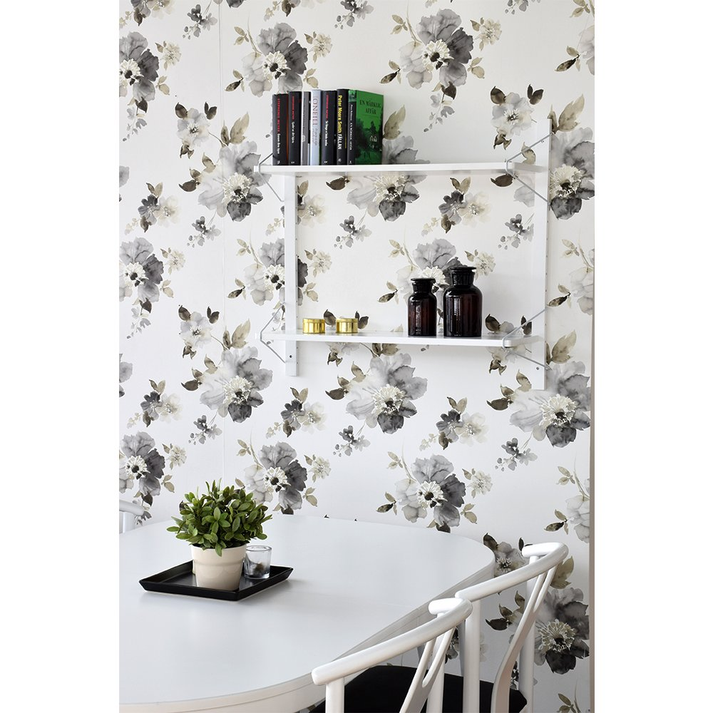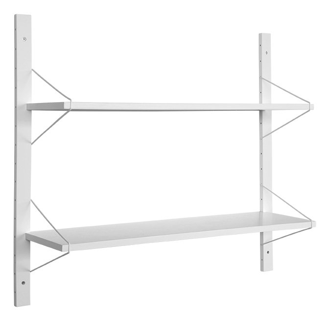 Elma är en vägghylla där man blandat retrodesign från 60-talet med dagens stilrena design. Vitlackade hyllplan och konsoller.