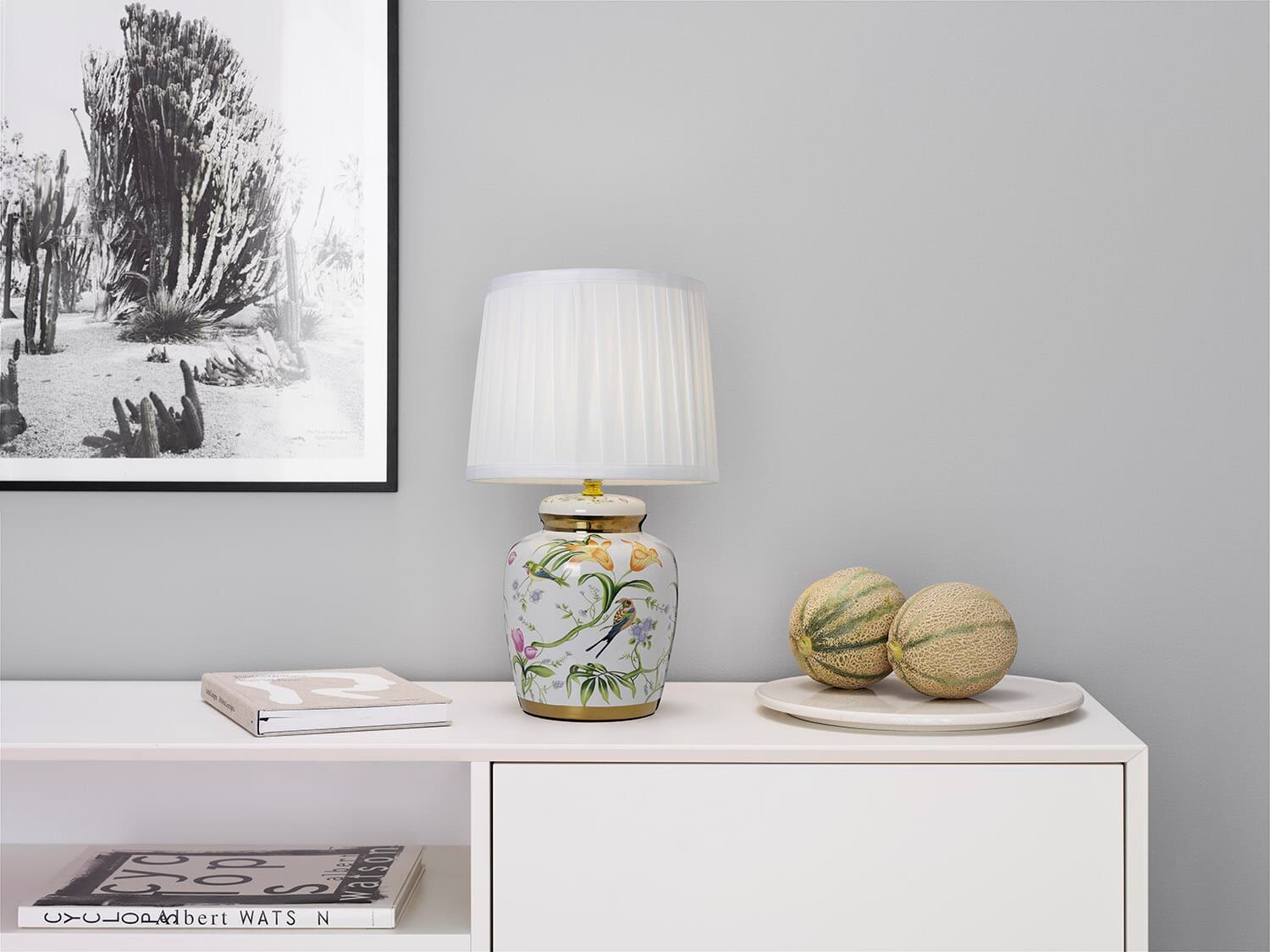 Klassisk bordlampa i keramik, vit botten med att vackert naturmönster och handmålade gulddetaljer. Till lampan medföljer en vit textilskärm. Lampan har en vit kabel med brytare.
