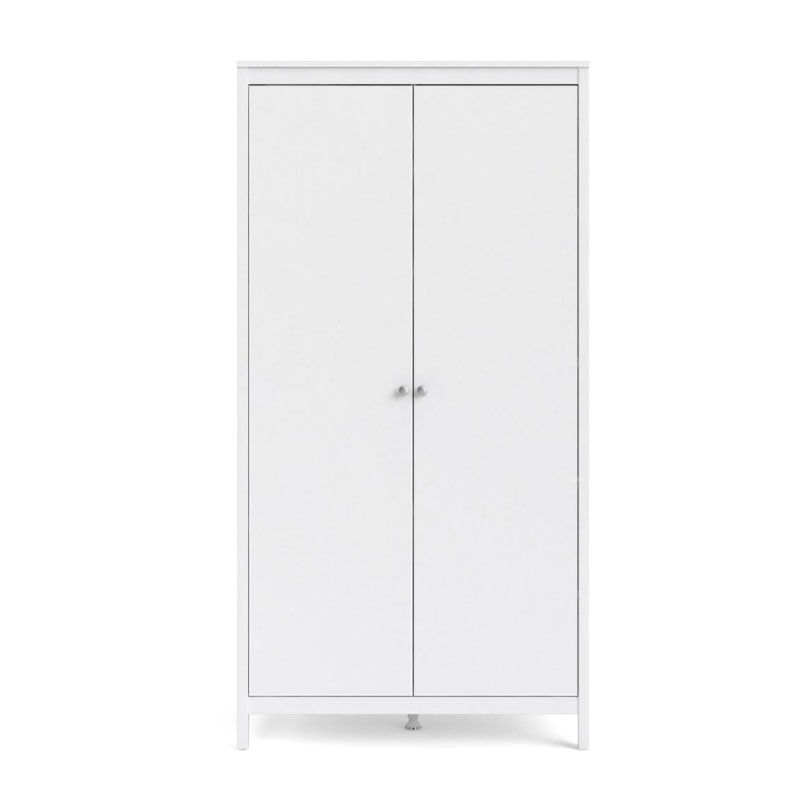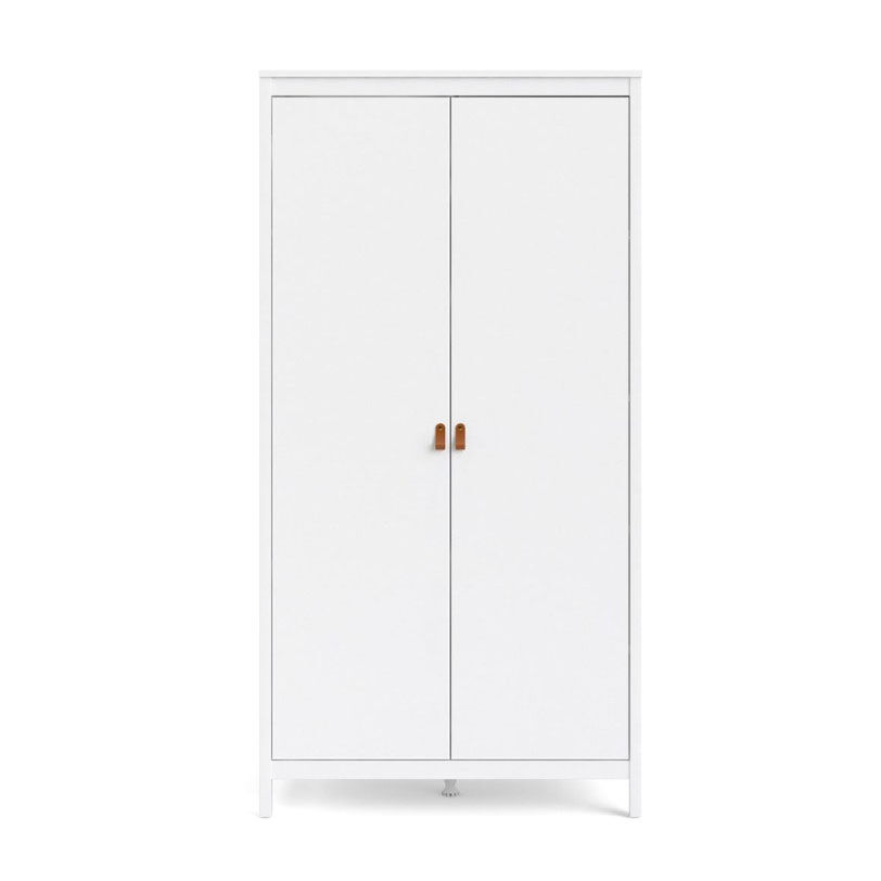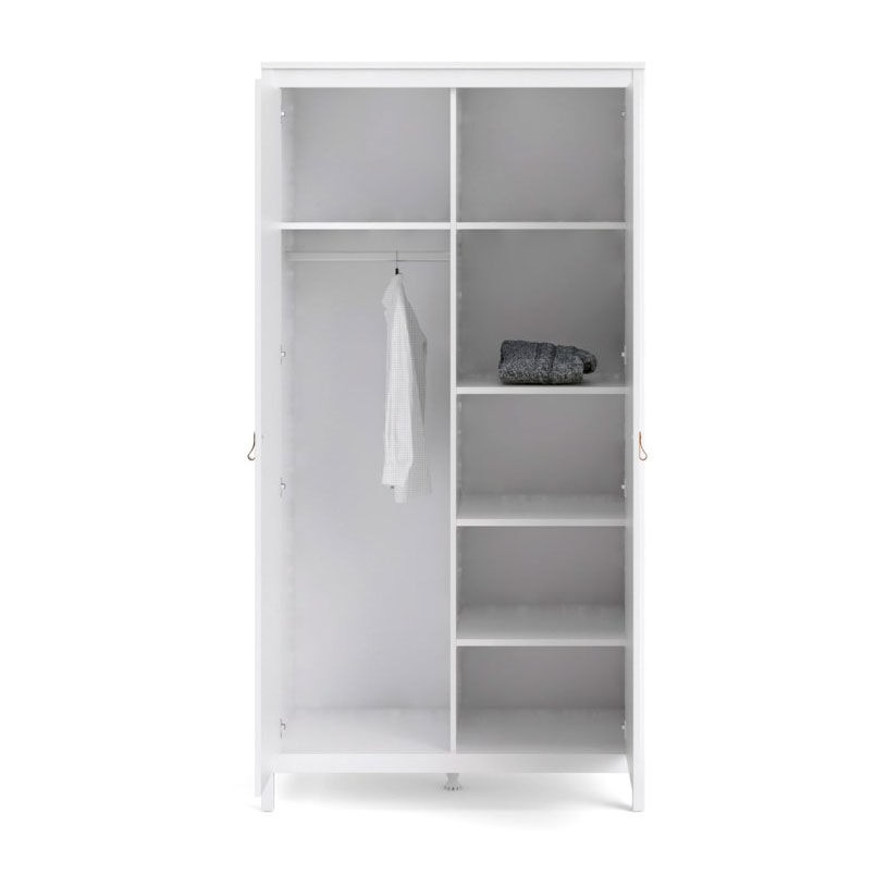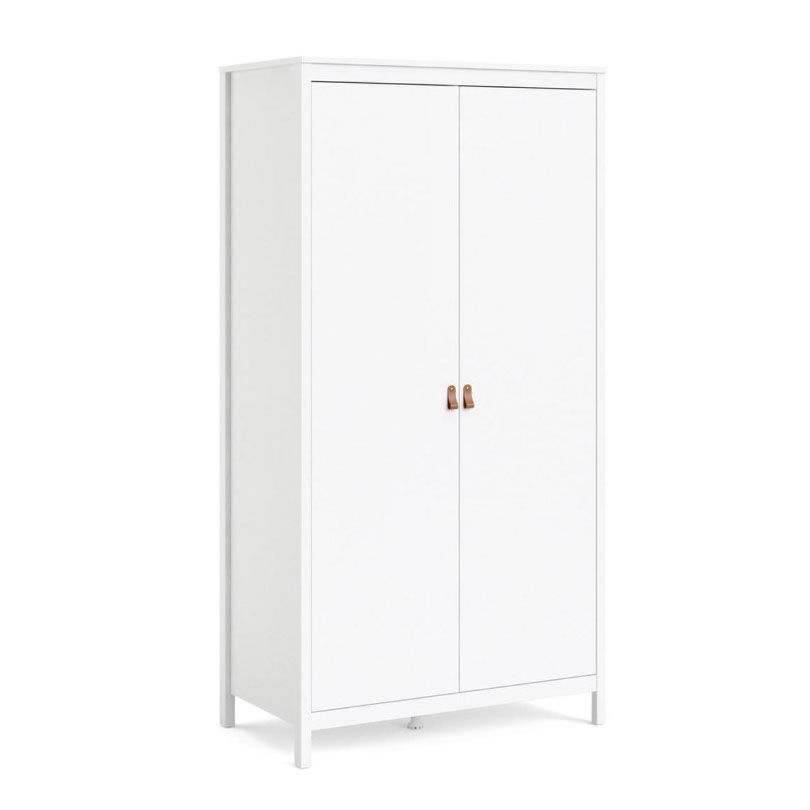 Stilren garderob med 2 dörrar i vitt. I garderoben finns mycket förvaring i form av 1 klädstång, 2 fasta och 3 flyttbara hyllplan. Medföljer två varianter på handtag – välj det som passar dig bäst, bruna i läder eller knoppar i plast.