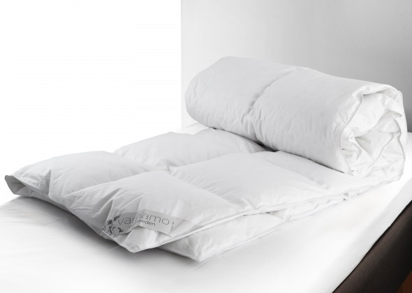 Duntäcke Lilja 150x210 cm. Sval, stoppvikt 300 gr. Mycket exklusivt duntäcke med tyg i finaste 100% bomull Super Cambric. Trådtäthet 280. Stoppat med 90% Pyreneiskt anddun och 10% fjäder. Täckena medium och varm är sytt i kassetter med kanalväggar, så att dunen isolerar utan förekomst av köldbroar. Kantat med vit passpoal. 10 års garanti mot bristande sömmar och otätheter. Öko-Tex standard 100 klass 1