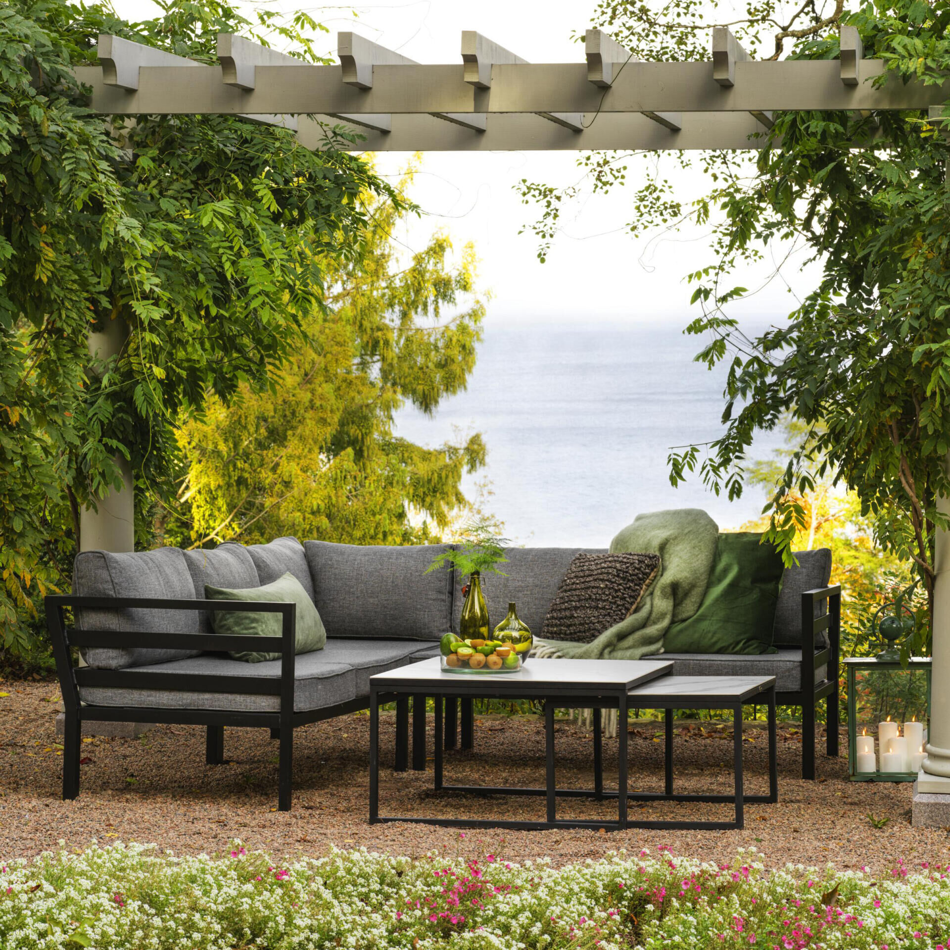 Weldon hörnsoffa 2H2. Bekymmersfri sommar med allvädersdynor! Med Weldons unika allvädersdynor behöver du inte vara orolig om du glömt dynorna framme under någon av sommarens alla regnskurar. Dynorna torkar snabbt och är gjorda av material som tål utomhusbruk extra väl. En byggbar serie, kan kompletteras med fler mittdelar för en större soffa.