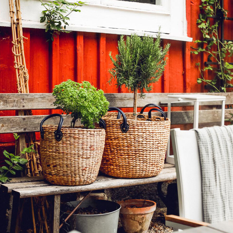 Stor rund korg vävd i naturfärgad vattenhyacint, med snyggt svarta handtag.