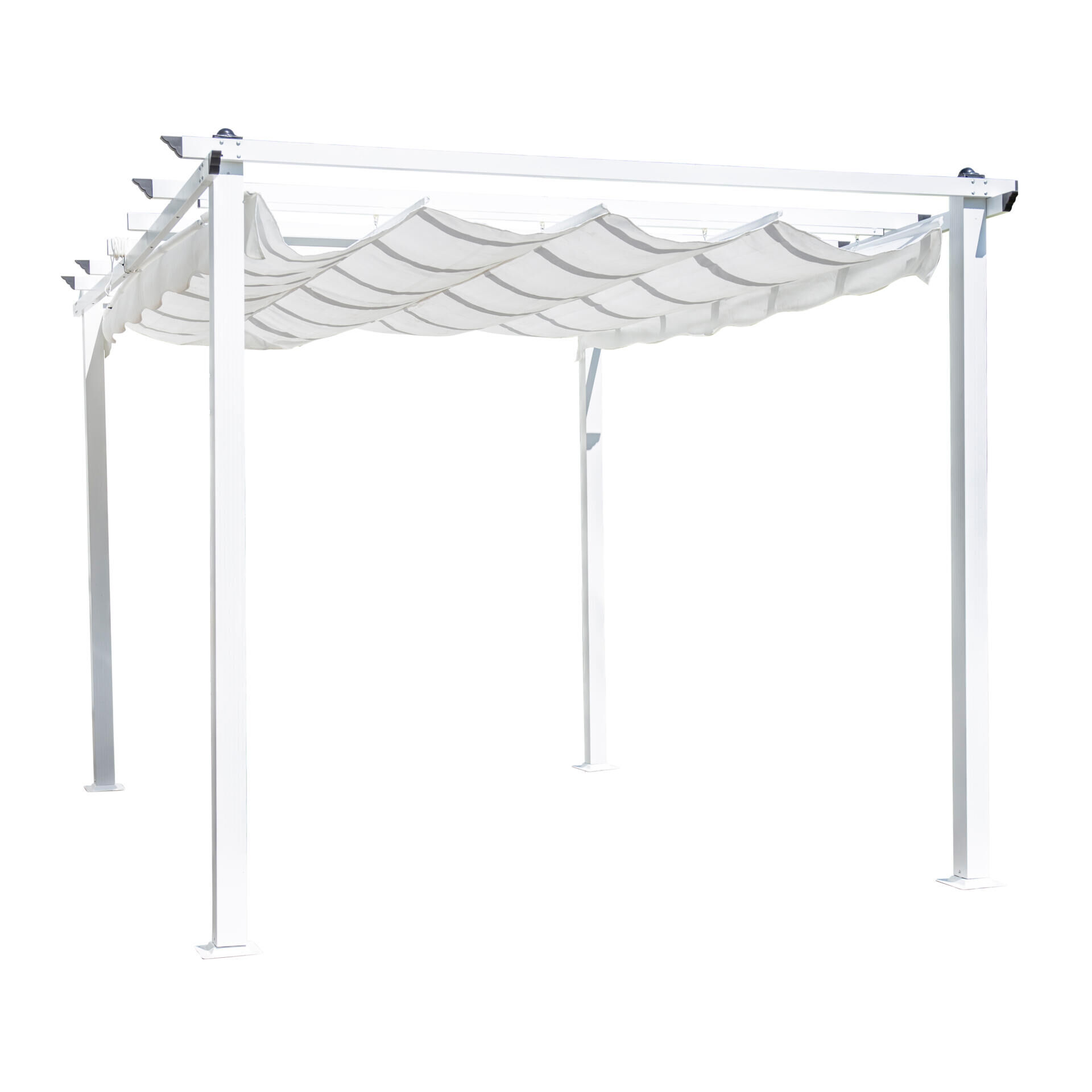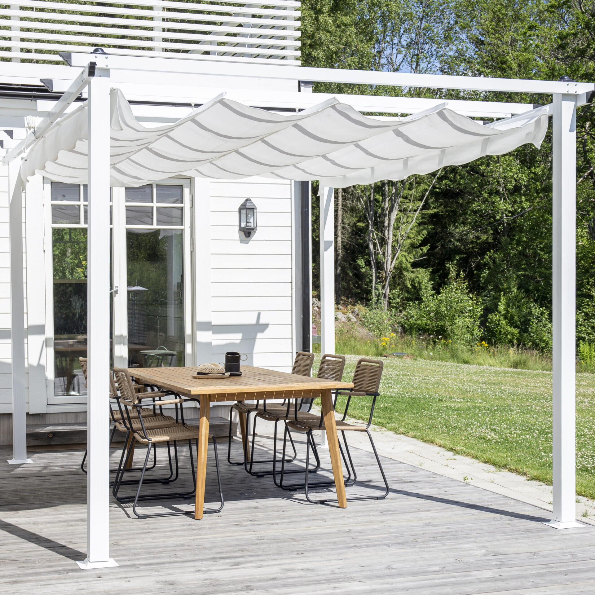 Trendig pergola från Venture Design, Lazio. Pergolans stomme är i vit aluminium och taket i vitt polyestertyg. Taket kan enkelt hissas ut/ihop beroende på om du önskar solskydd eller ej. Pergolans ben bör förankras i marken.