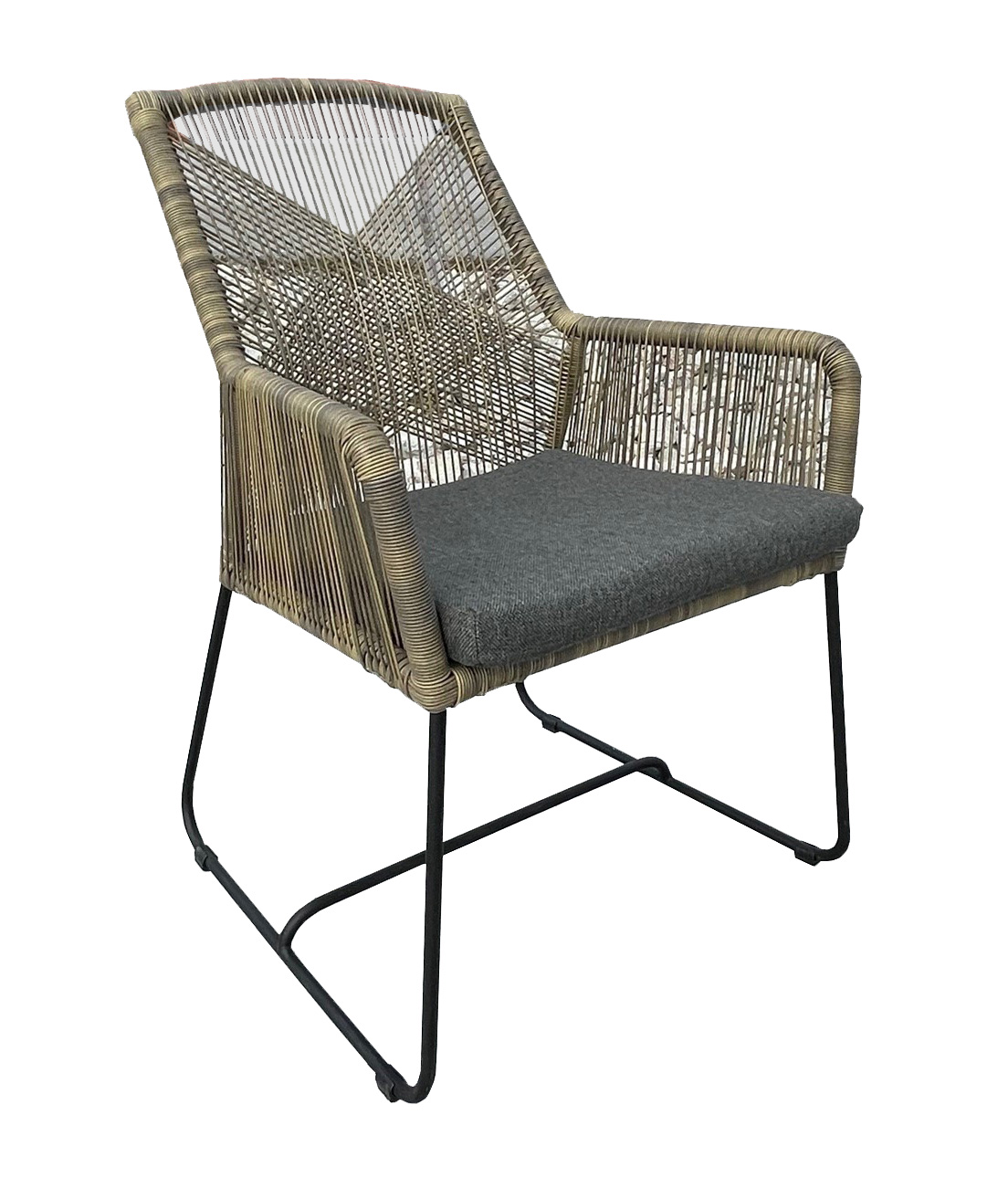 Karmstol i beige twistad konstrotting/rep med en svart stålstomme och en mörkgrå sittdyna. Passar till flera olika typer av bord!