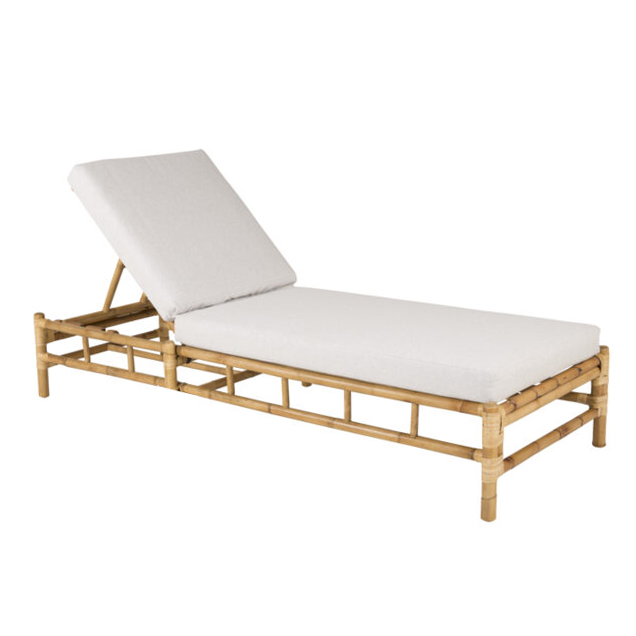 Brändaholm solsäng i bambu med rejäl ljus dyna. Ryggen är ställbar i olika lägen. Denna modell har hjul på ena kortsidan för smidigare förflyttning.