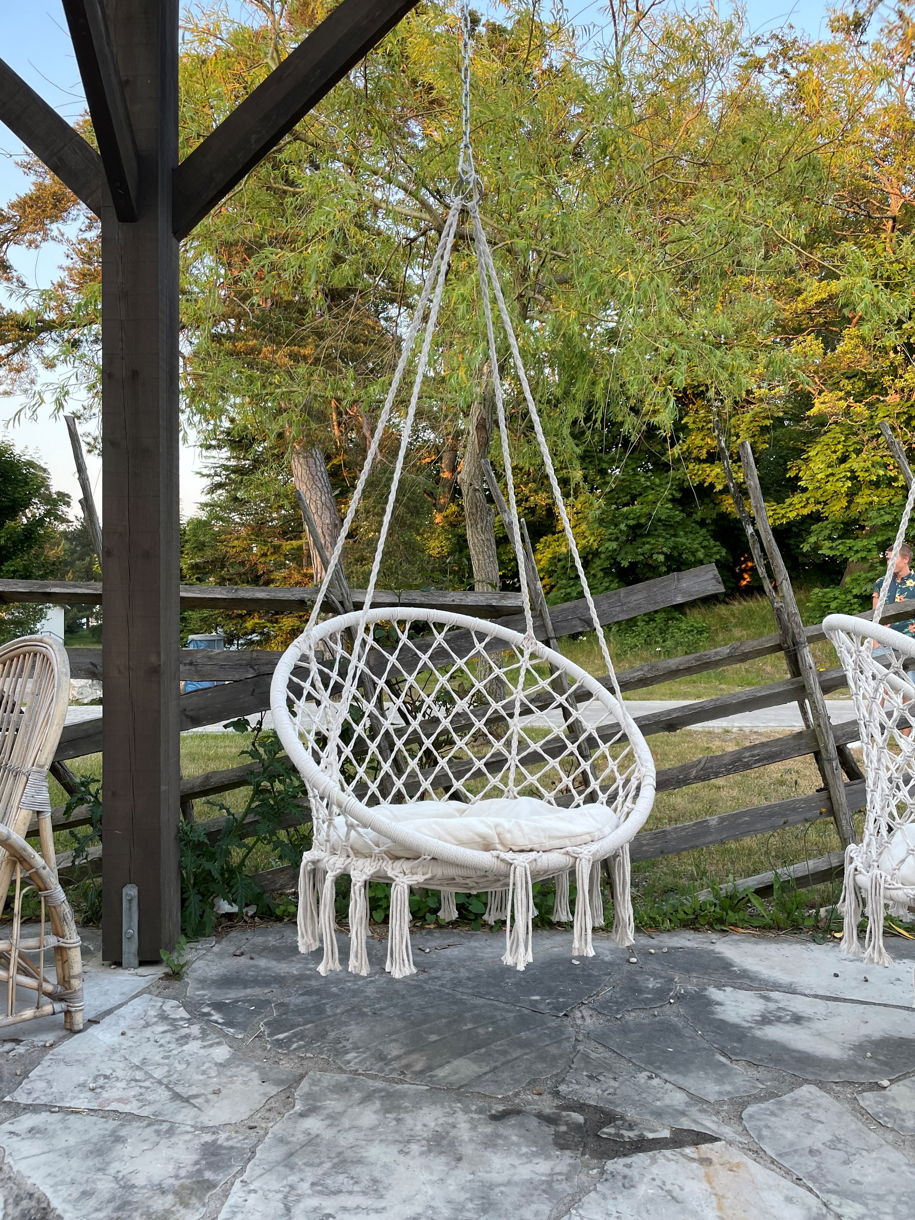 Koppla av i en mysig hängstol. Denna variant i bomull har fina detaljer som dekorativa tofsar. Medföljer en mjuk dyna för extra skön komfort. Lämplig för både inom- och utomhusbruk och tar liten plats vid förvaring.
