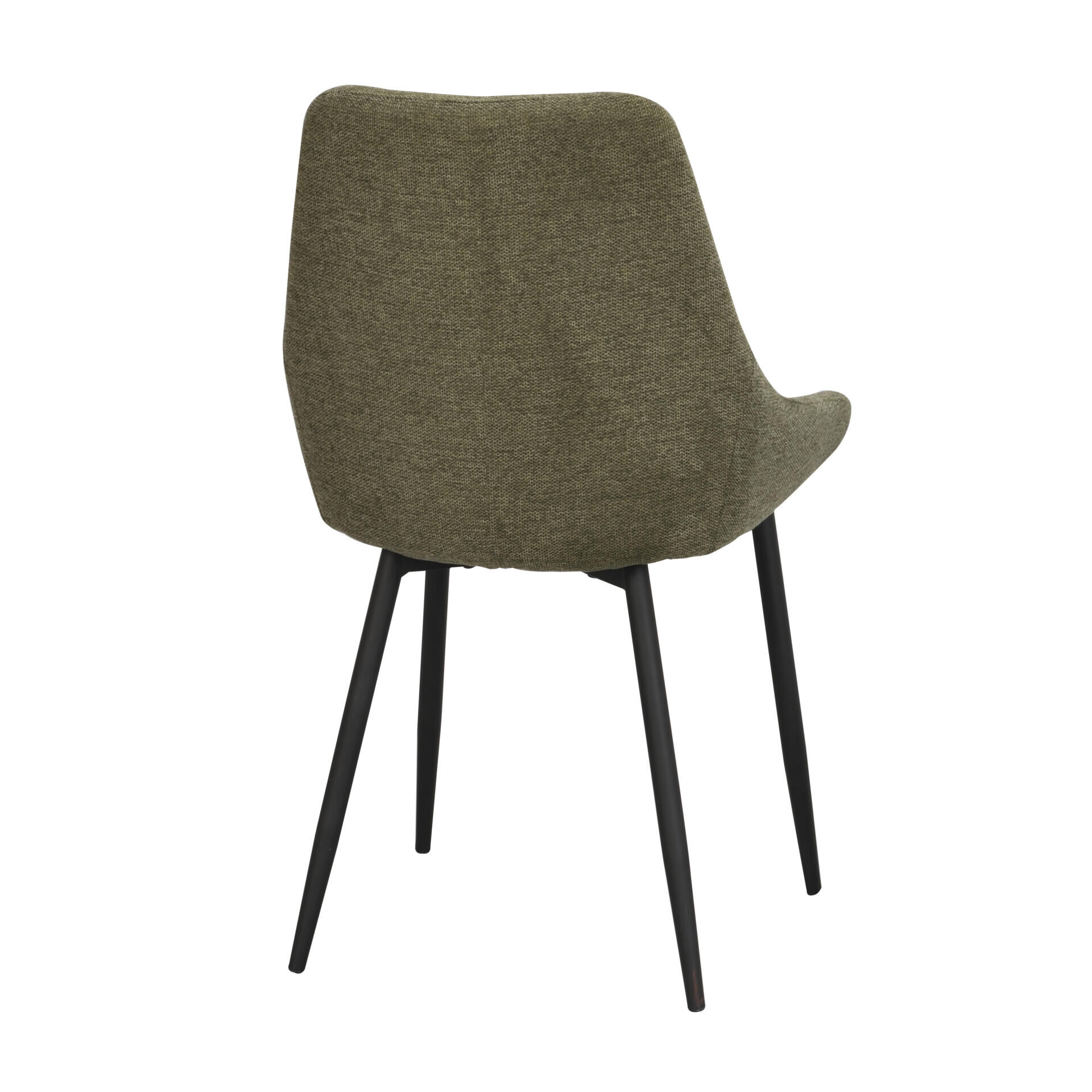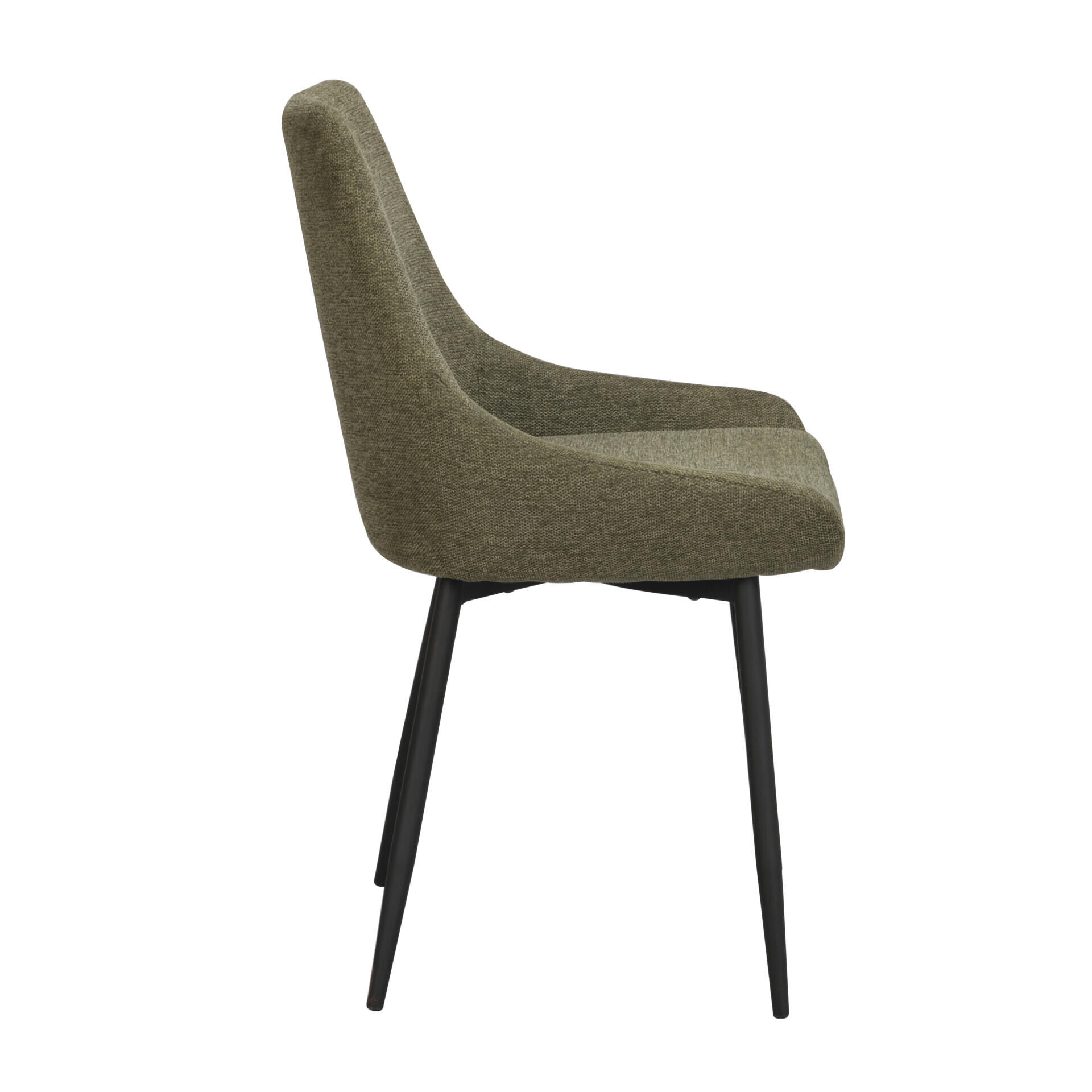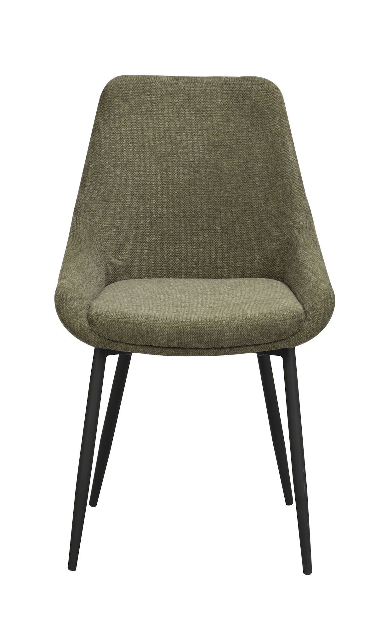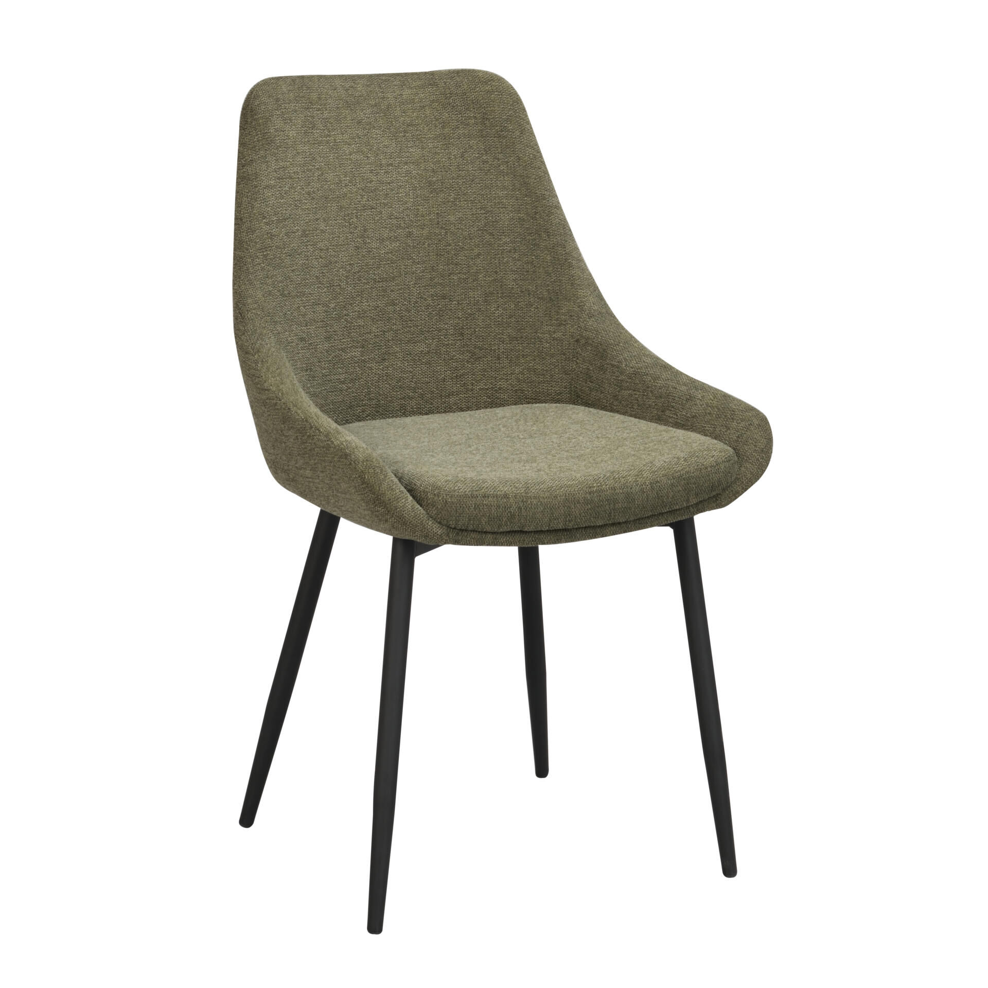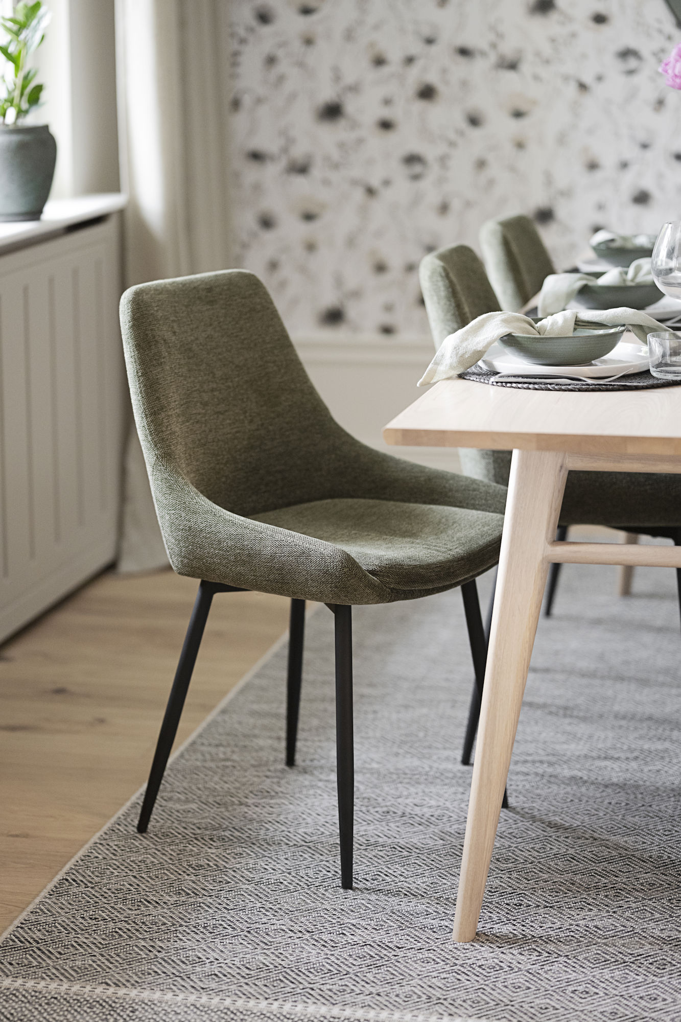 Populära Sierra stol i modern design med skön sittkomfort. Stolen finns i flera olika färger och passar perfekt i våra skandinaviska hem. Här syns den med sits i grönt polyestertyg. Tyget har hög slitagenivå och stolen har tåliga ben i svart pulverlackad metall. Sierra stol passar utmärkt runt matbordet men även som udda stol i hallen, sovrummet eller till skrivbordet. Stolen är FSC-certifierad.