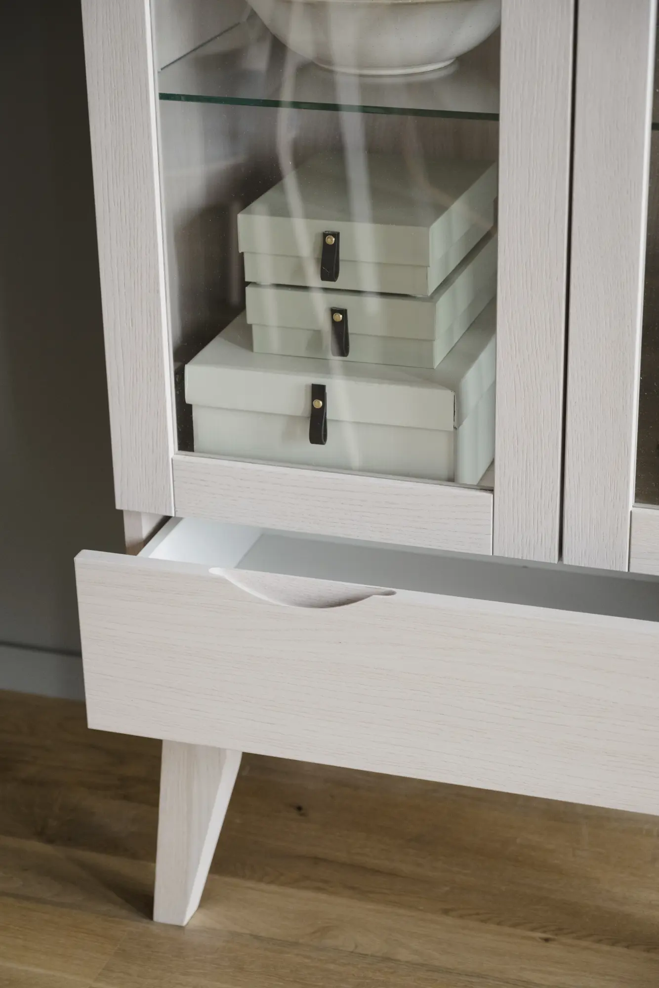 Stilrent och rymligt vitrinskåp i lackad vitpigmenterad ek med glasdörrar samt en låda. Mjukstängande låda och dörrar samt flyttbara hyllplan i härdat glas. Vitrinskåpet ingår i vår breda Filippa-serie som även har flera matchande matbord och soffbord i olika storlekar.
