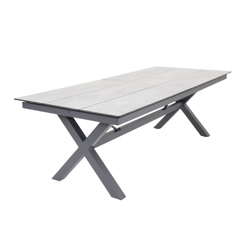 Bordet X-leg är ett både praktiskt och snyggt utebord. Toppskiva i tålig laminat med en snygg betonglook och underrede med kryssben i lackad aluminium. Bordet har också en praktisk iläggsskiva som förvaras i bordet då den inte används – perfekt när det väntas gäster.
