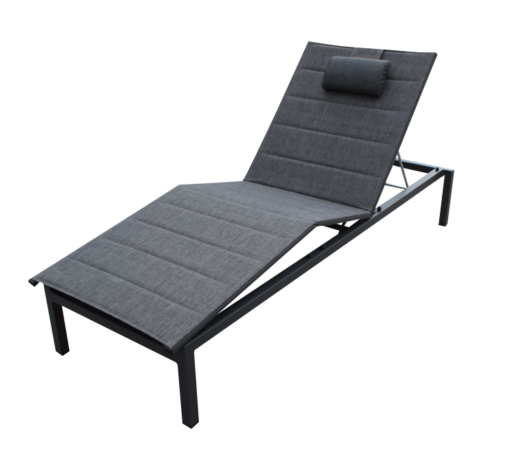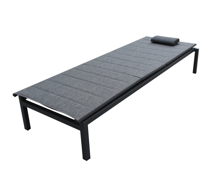 Dallas är en serie med nätta aluminiummöbler med stoppad med QuickDry-skum. Solsängen har mörkgrå sits och antracitgrått stativ. Solsängens bakre ben är försedda med hjul för enkel förflyttning. Avtagbar nackkudde ingår.