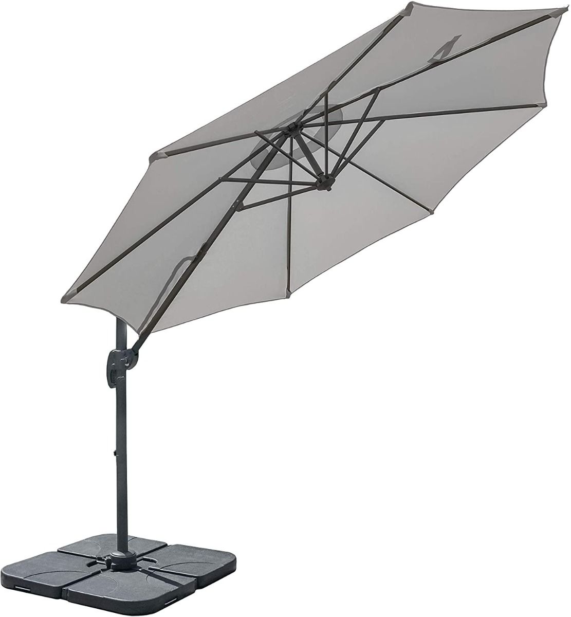 Candy är ett smidigt parasoll med sidoarmshäng. Här med rund parasollduk 350 cm. Du fäller enkelt upp och ned parasollet och kan med lätthet rotera det så du får skugga där du vill. Smart kryssfot som går att fästa i altan, det finns även smidiga tyngder att köpa till som placeras i de fyra ”hålen” i foten. Komplettera med 1-4 tyngder för ett parasoll som står stabilt trots vind. Till Candy parasollet ingår ett parasollskydd.