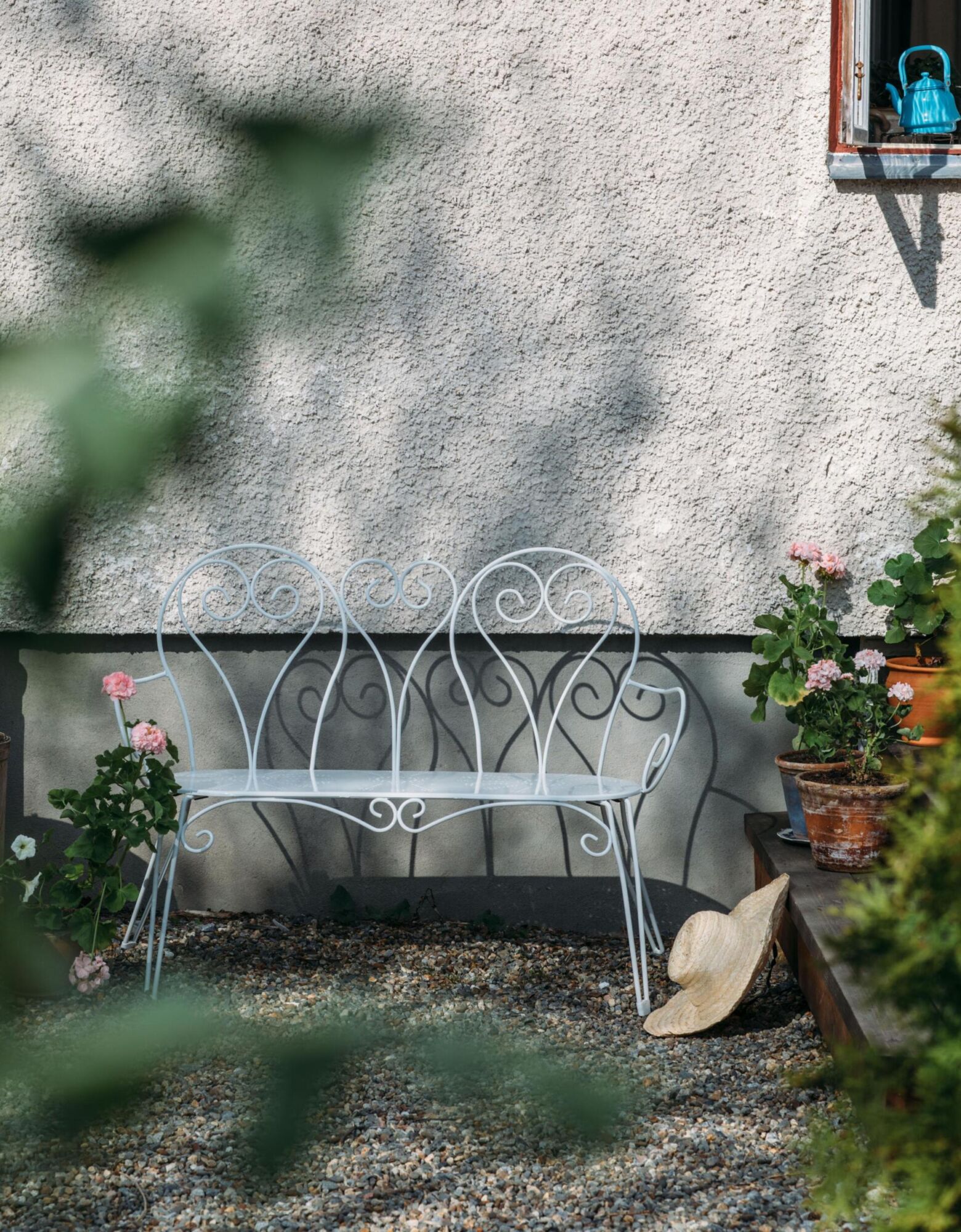 Soffa med ”vintagekänsla” i vitt epoxylackerat stål. Levereras med dyna i grått.