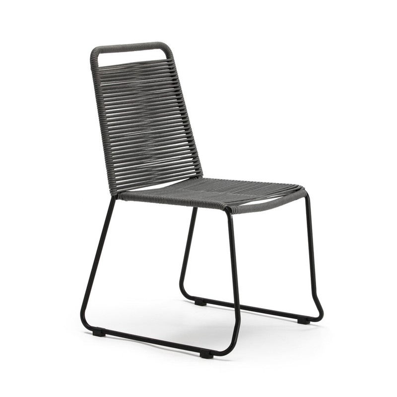 Barcelona är en modern stol för utomhusbruk. Stomme i svartlackerat galvaniserat stål med sits i grått rep.