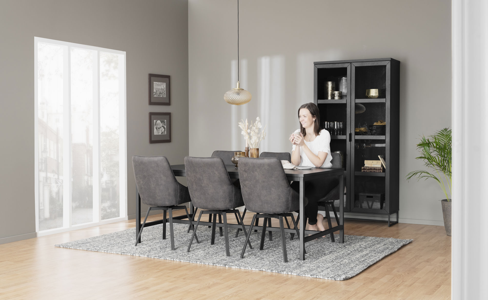 Populära Alison stol med underrede som har snurrfunktion. Här syns den i ett tåligt grått microfibertyg och med ben i pulverlackad svart metall. Alison har en stoppad sits med hög sittkomfort i kupad design och ben med snurrfunktion i 360 grader. Stolen passar perfekt runt matbordet men även som udda stol till skrivbordet. Alison finns även i andra jordnära färger.