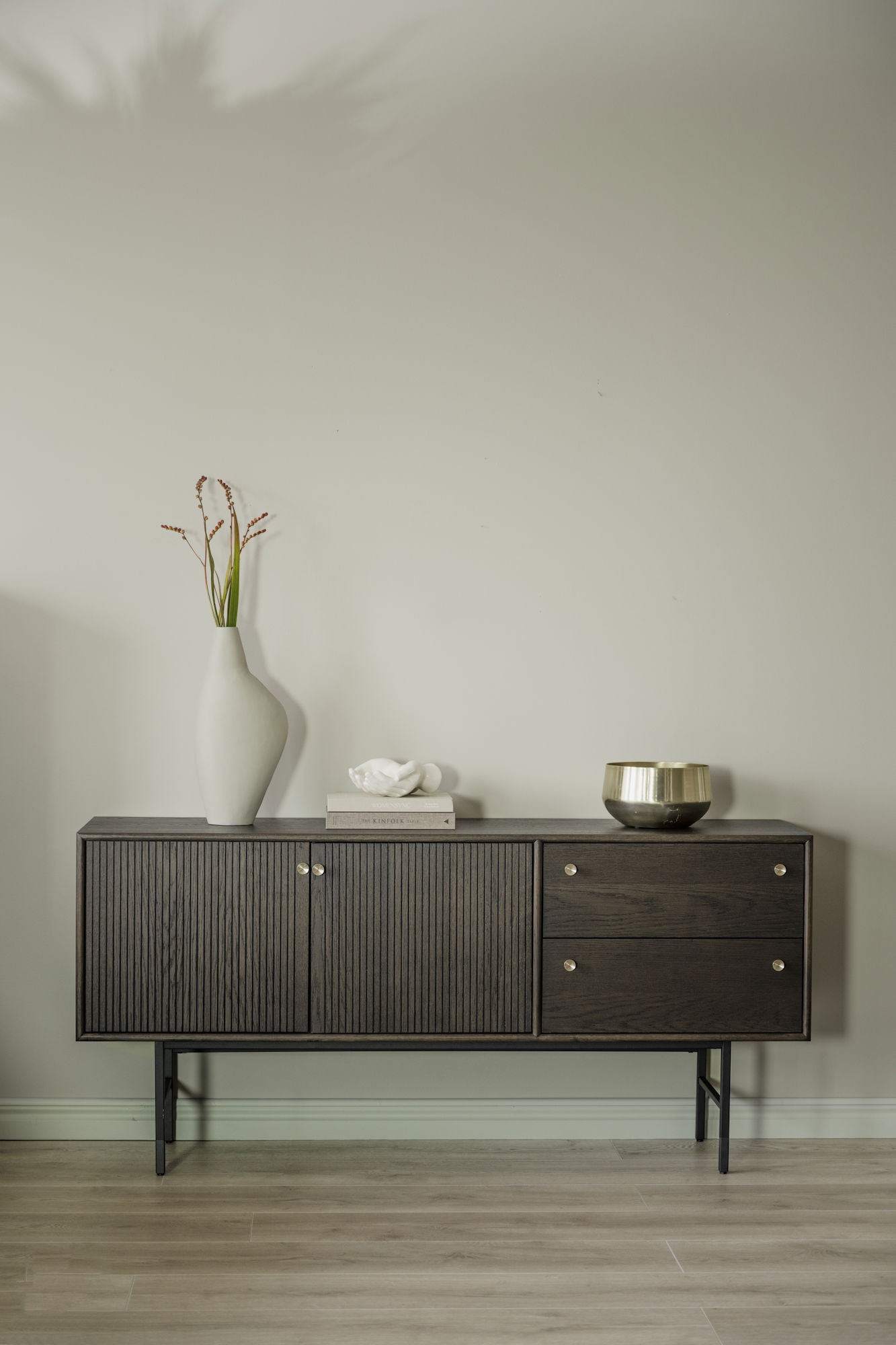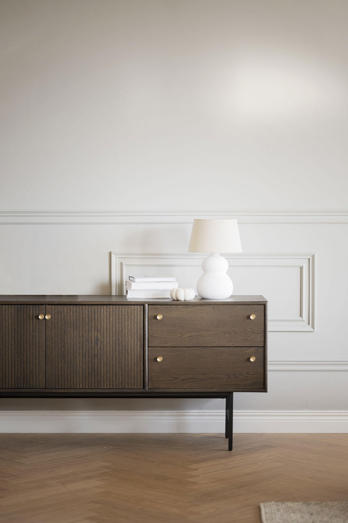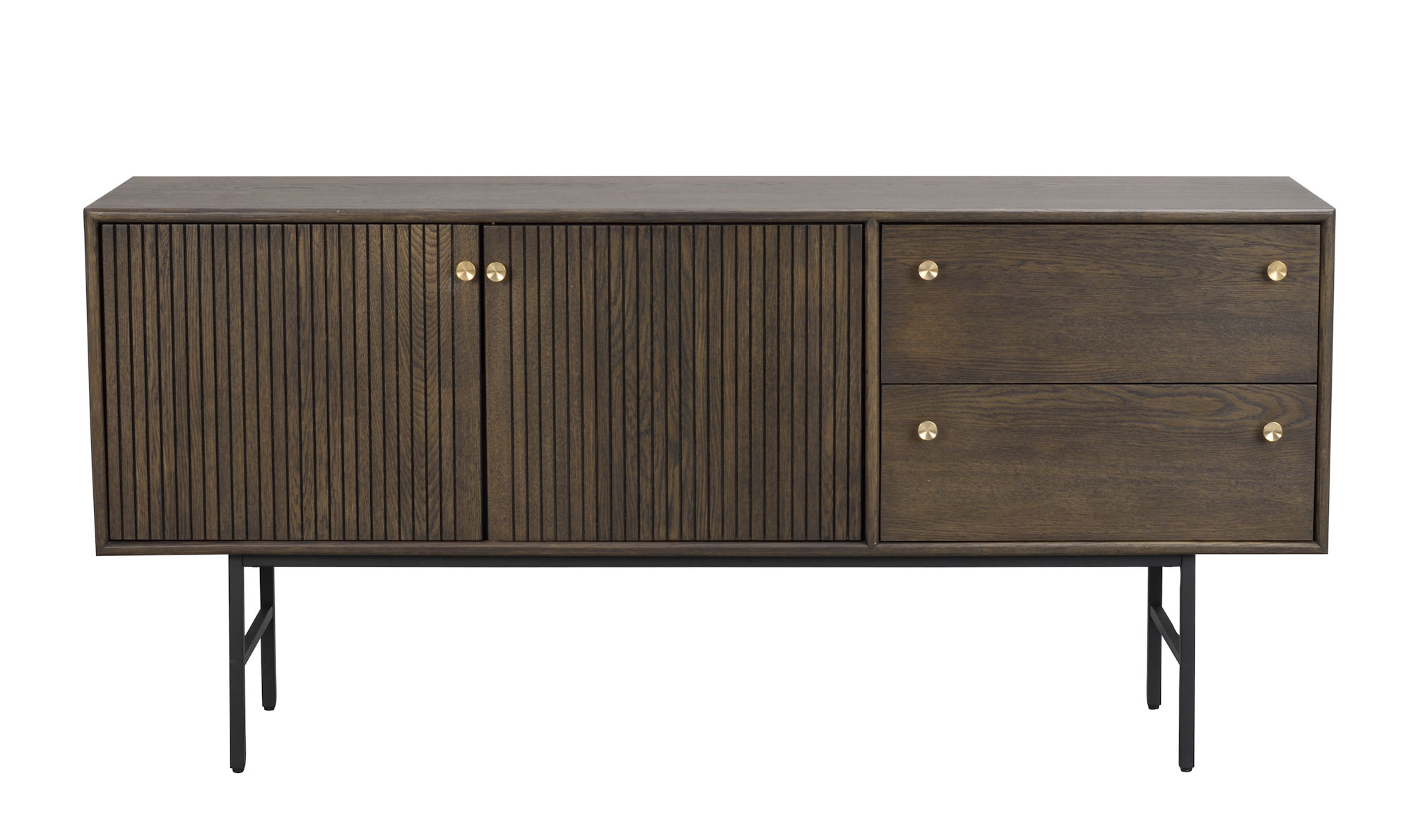 Clearbrook sideboard i en lackad brun ekfärg med svarta metallben. Skänken är i brunbetsad ekfanér med massiva kanter och har en hylla av trä innanför dörrarna. Sideboardet har praktiska lådor på ena sidan och mässingsfärgade beslag. Lådor och dörrar med mjukstängning. Det ingår även ett skåp i serien.
