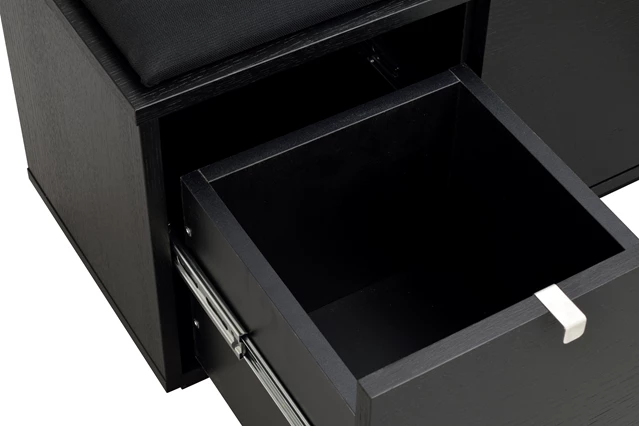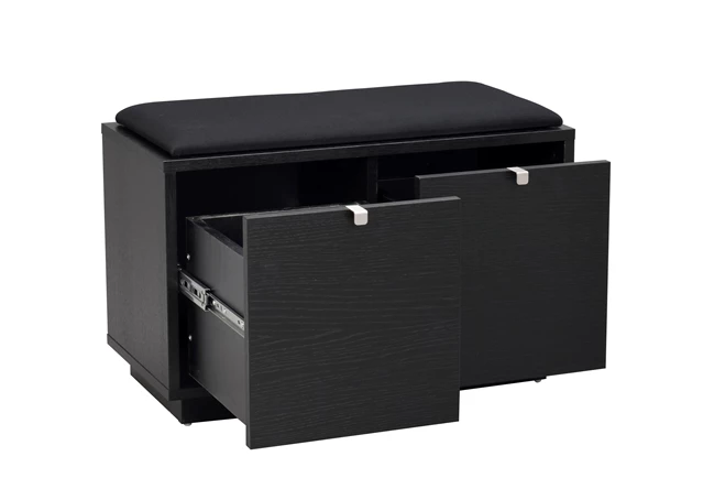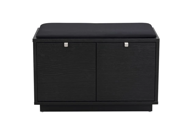 Confetti sittbänk i fanerad svartlackad ek. Praktisk och stilren sittbänk med två rymliga lådor som tar hand om förvaringen. Ingår i hallserien Confetti.
