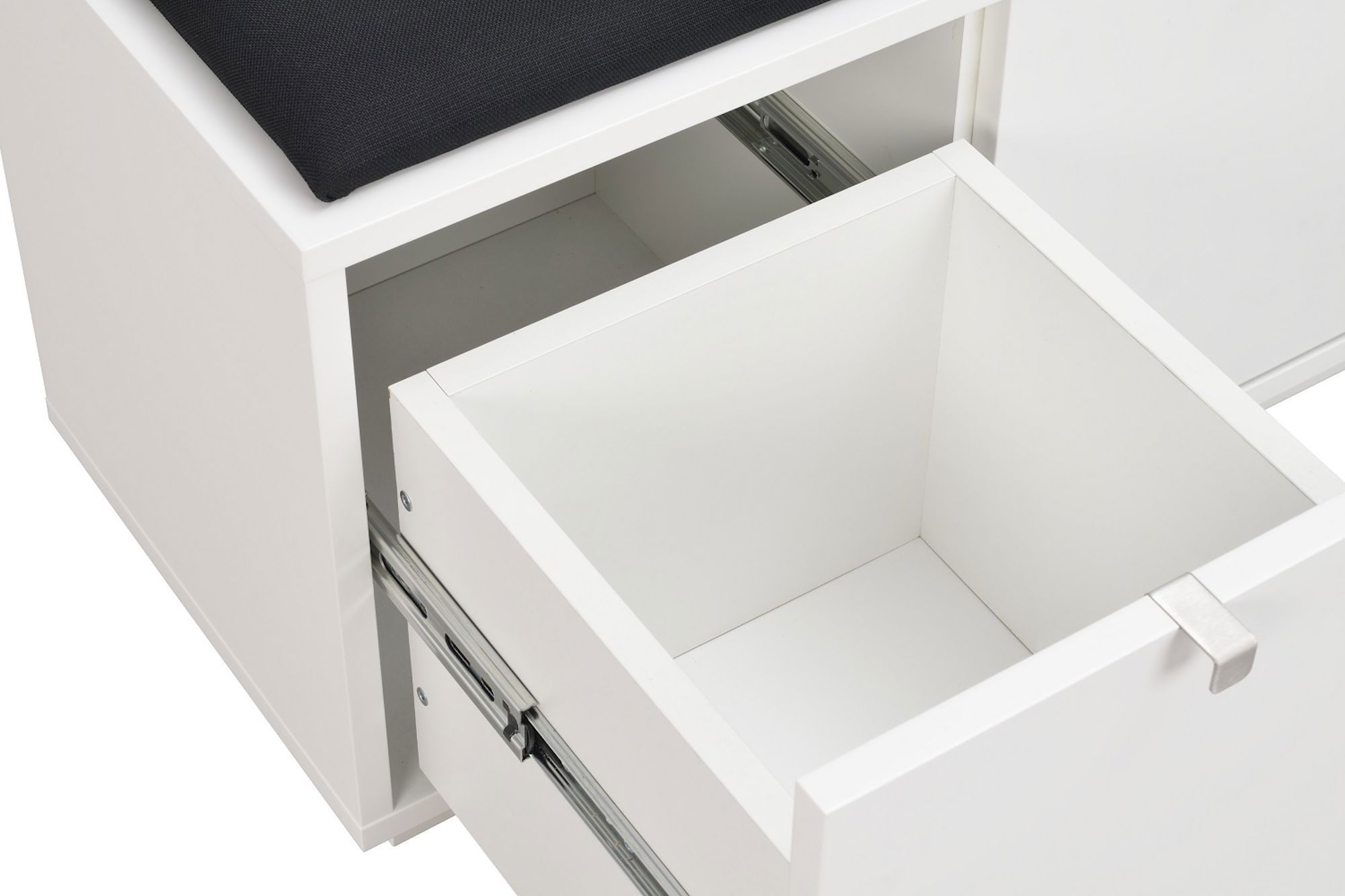 Confetti sittbänk i vitlackad MDF. Praktisk och stilren sittbänk med två rymliga lådor som tar hand om förvaringen. Ingår i hallserien Confetti.