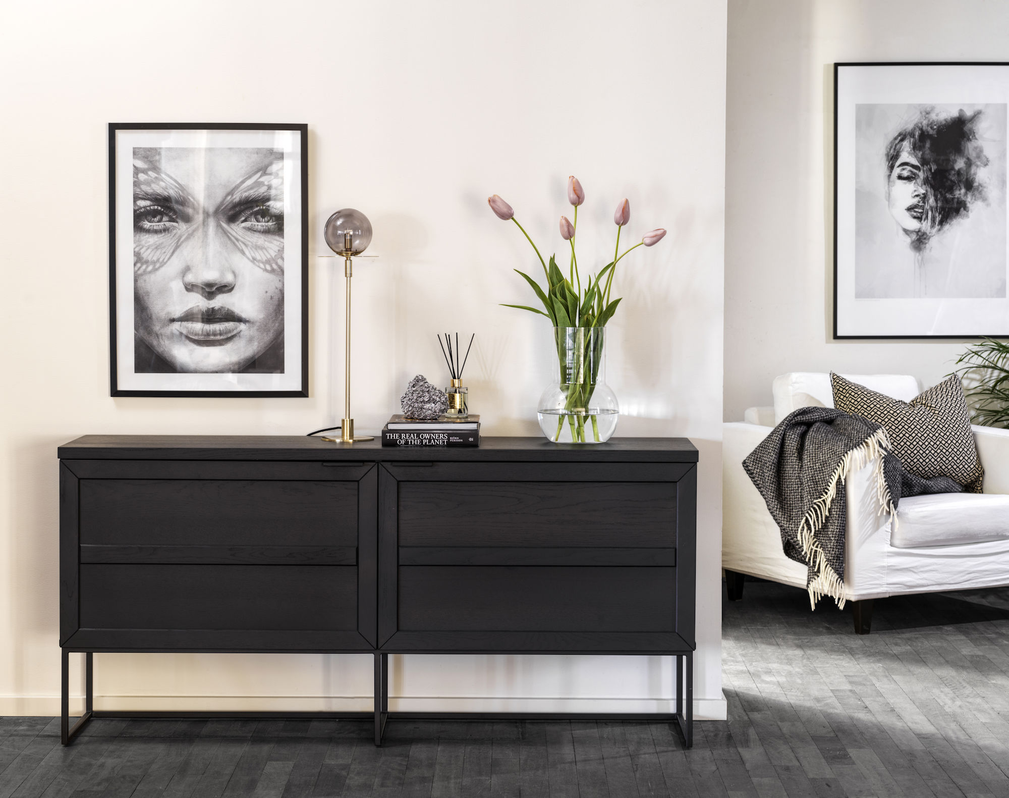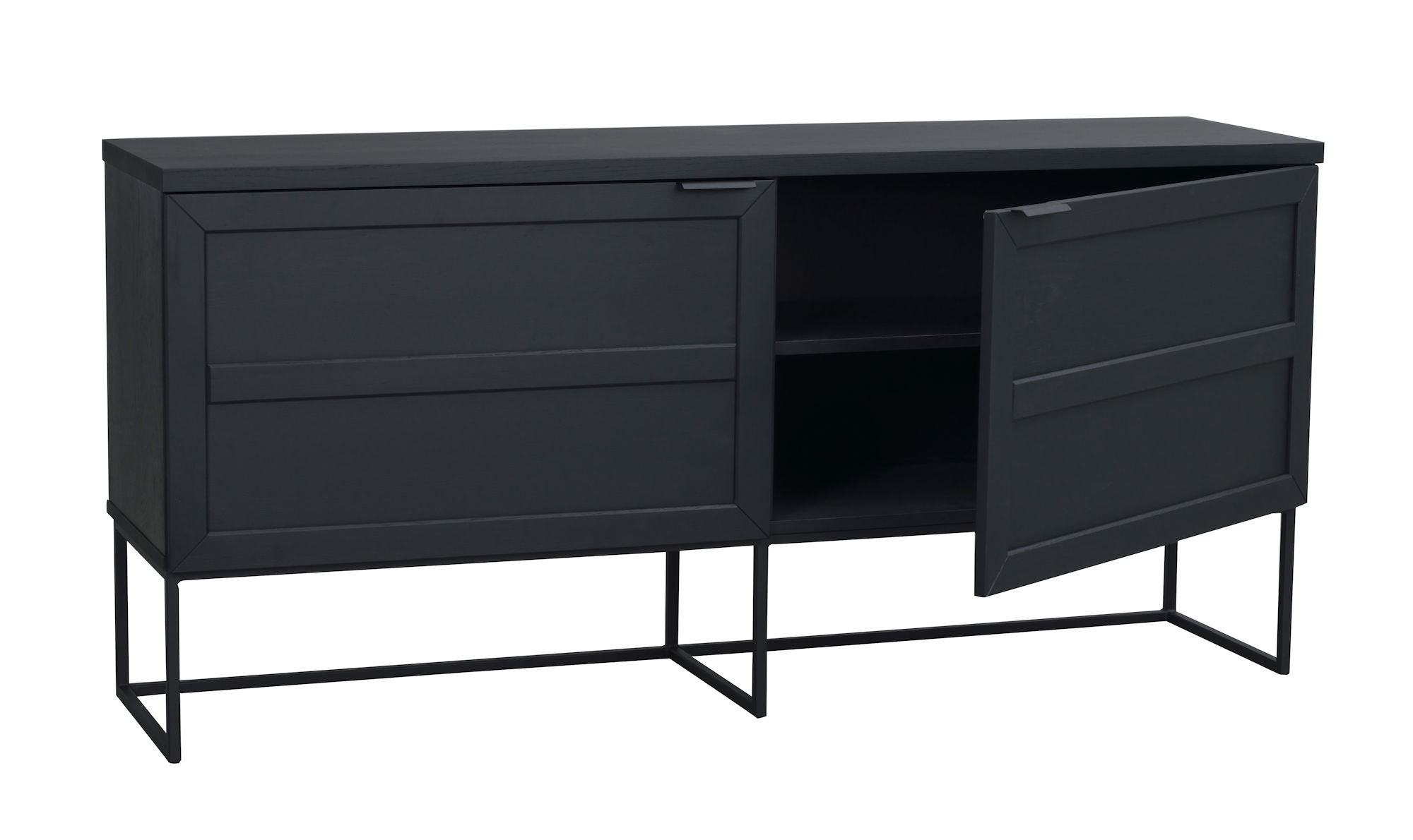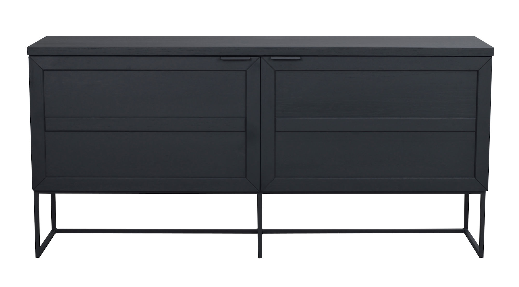 Everett sideboard i lackad massiv svartmålad 100% FSC-certifierad ek med svart metallunderrede samt handtag. Sideboardet har trädörrar och en modern borstad yta där kvistar kan förekomma och är med och bidrar till möbelns äkta träkänsla. Innanför dörrarna sitter ett fast hyllplan och dörrarna har mjukstängande soft-close funktion. I serien ingår det förutom förvaring även matbord.