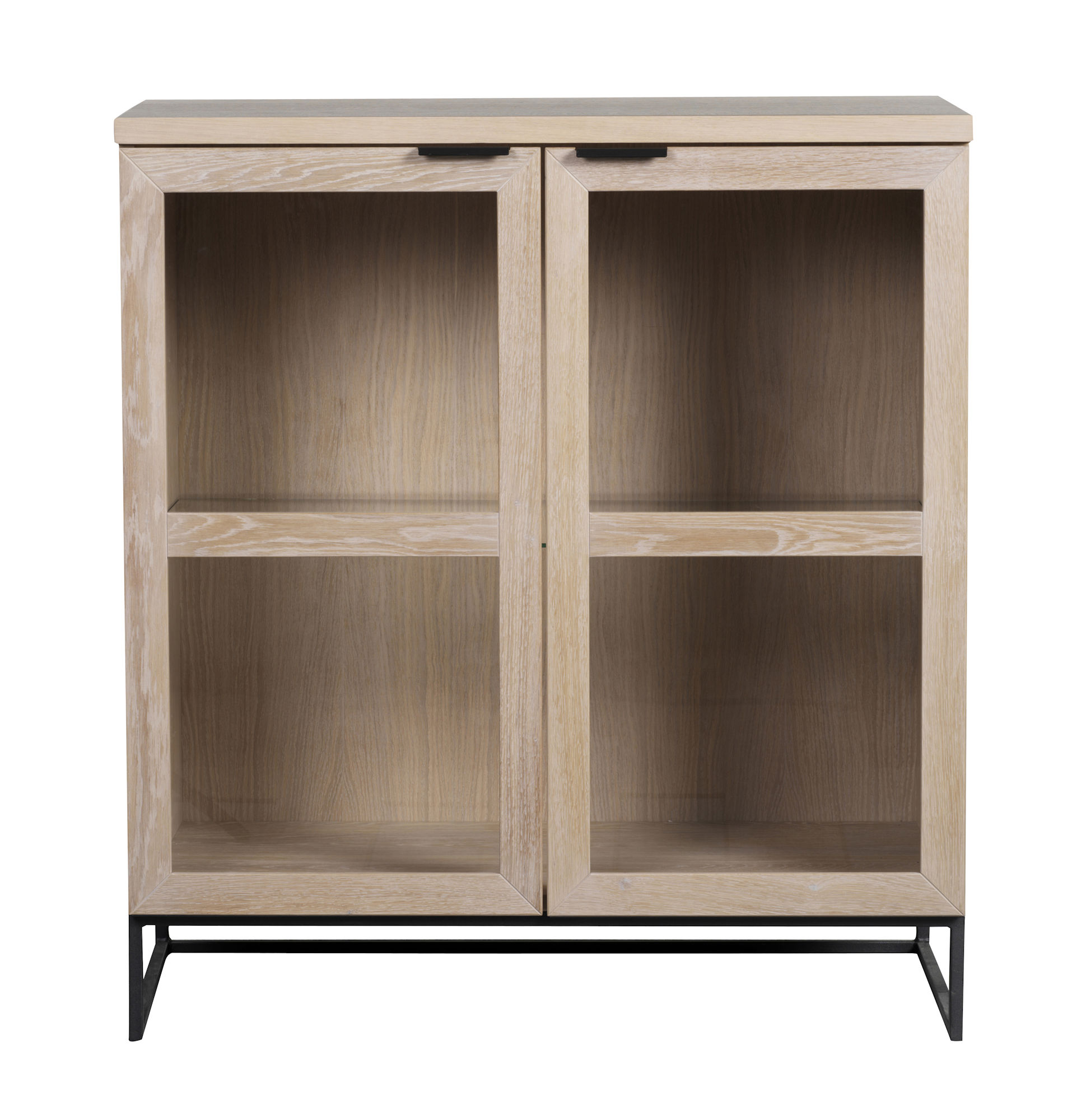 Everett skåp H105 cm i lackad massiv vitpigmenterad 100% FSC-certifierad ek med handtag och låg benställning av svart metall. Skåpet har glasdörrar och en modern borstad yta där kvistar kan förekomma och är med och bidrar till möbelns äkta träkänsla. Innanför dörrarna sitter ett flyttbart hyllplan och dörrarna har mjukstängande soft-close funktion, vilket bidrar till en exklusiv känsla. I serien ingår det förutom förvaring även matbord.