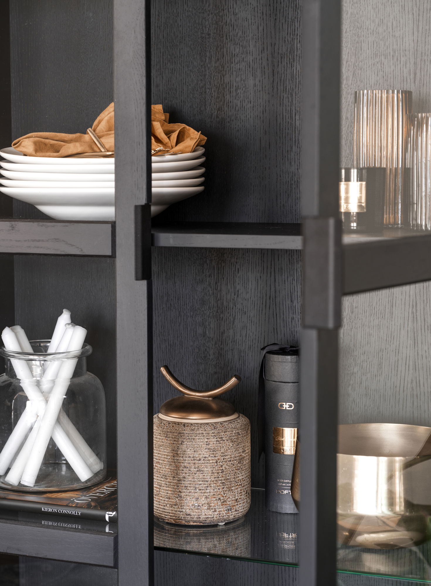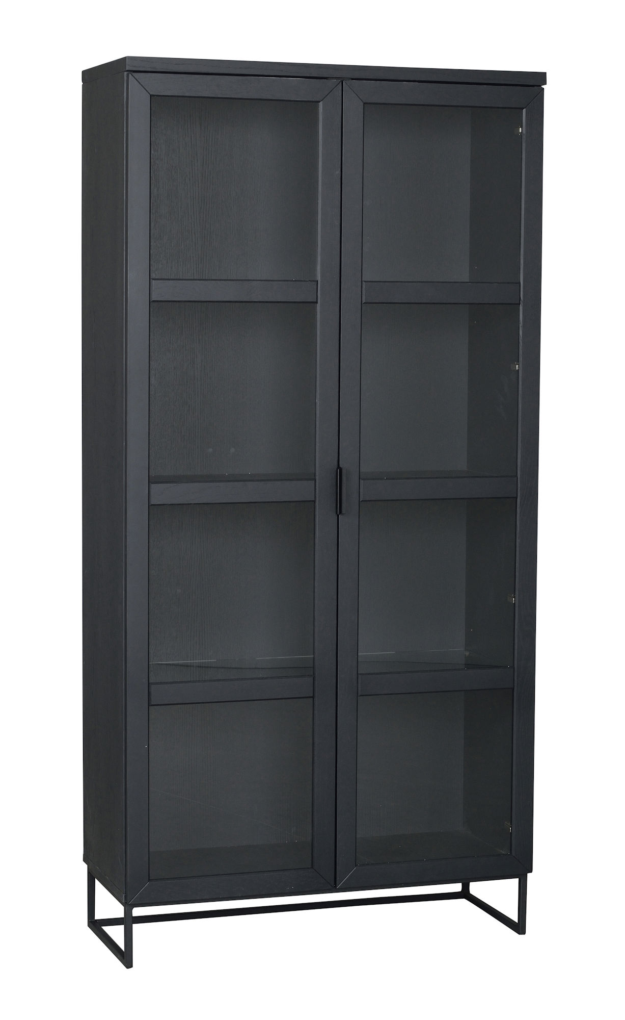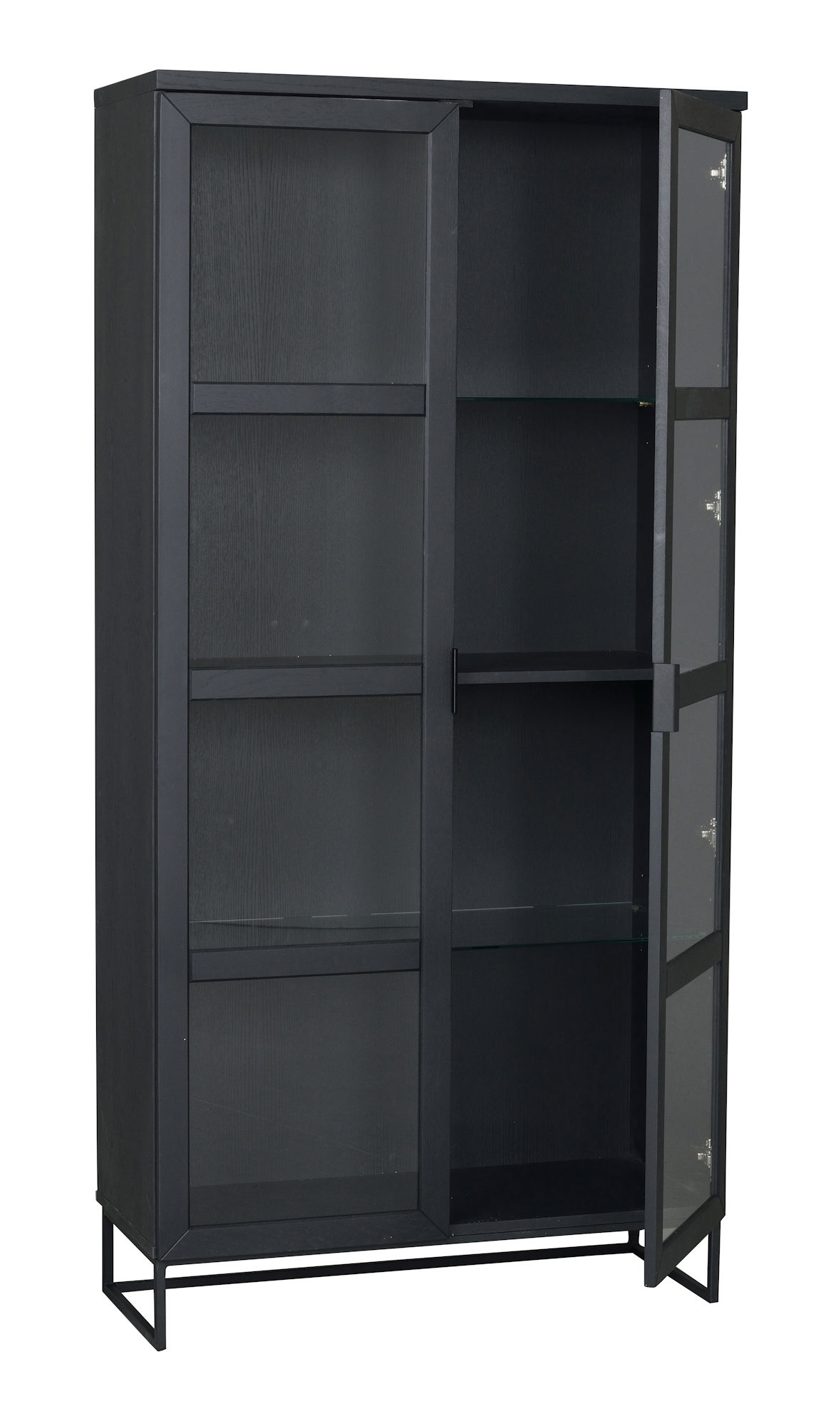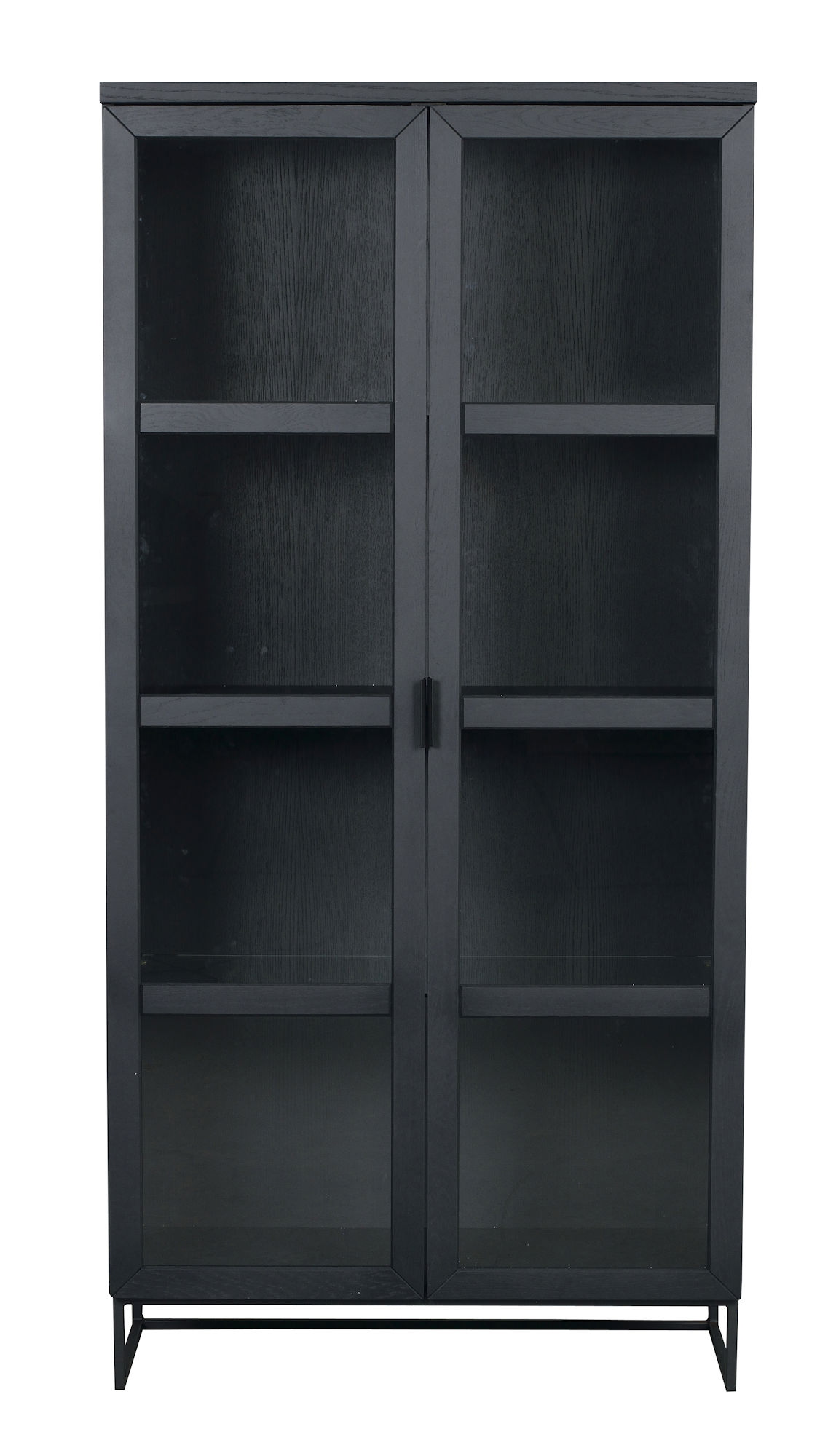 Everett vitrin i lackad massiv svartmålad 100% FSC-certifierad ek med svart metallunderrede samt handtag. Vitrinskåpet har glasdörrar och en modern borstad yta där kvistar kan förekomma och är med och bidrar till möbelns äkta träkänsla. Innanför dörrarna sitter tre hyllplan, varav två är flyttbara och dörrarna har mjukstängande soft-close funktion. I serien ingår det förutom förvaring även matbord.