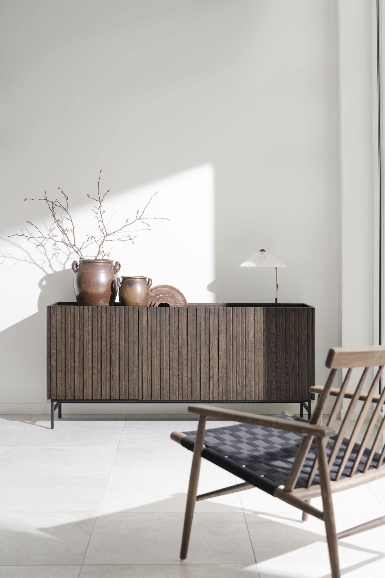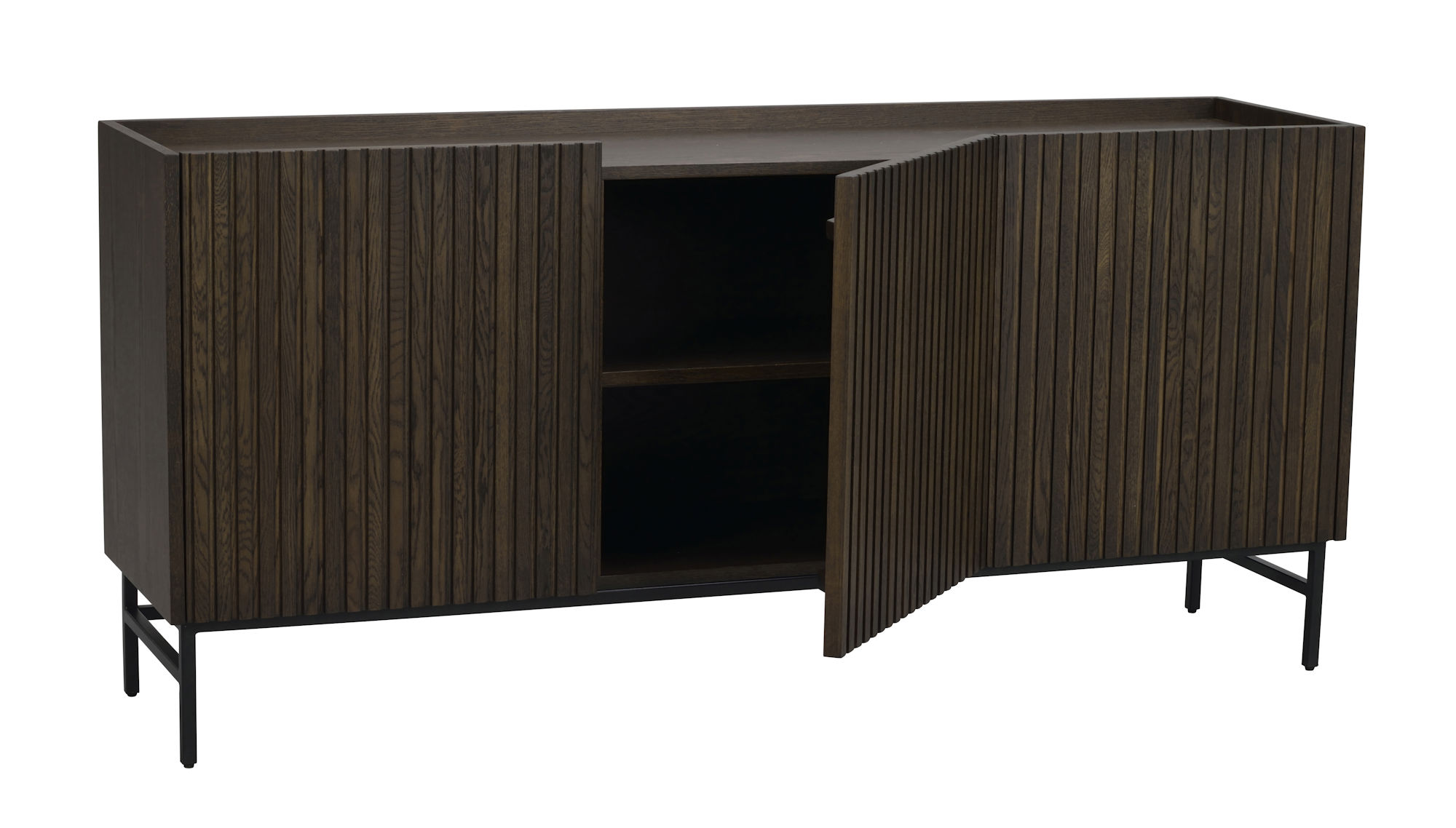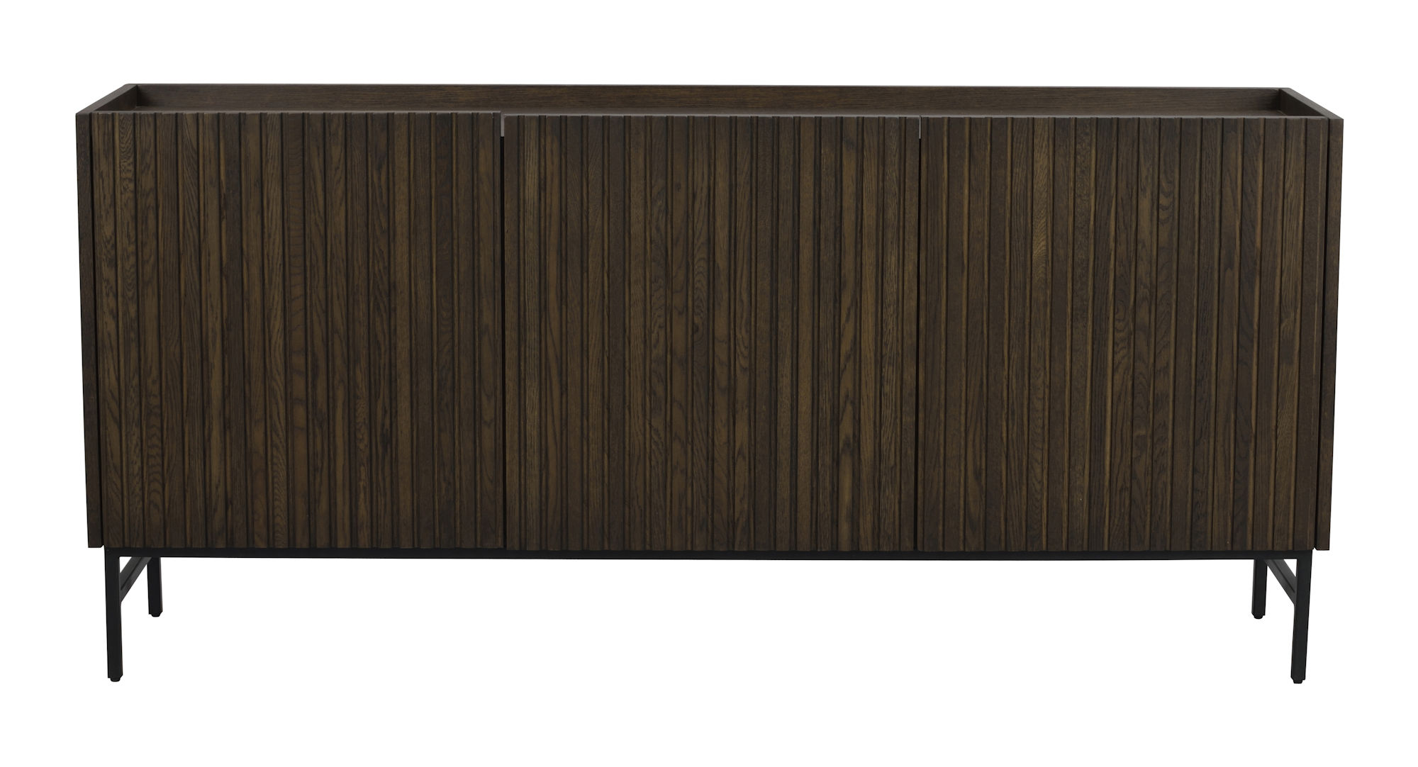 Trendiga Halifax sideboard i brunlackad ek med svarta metallben i rak elegant profil. Ytan består av massiva ekribbor på faner. Knoppar i guldfärgad borstad metall medföljer och du väljer själv om du vill sätta dit dem eller ha utan. Dörrarna har mjukstängande soft-close funktion och innanför finns flyttbara hyllplan.