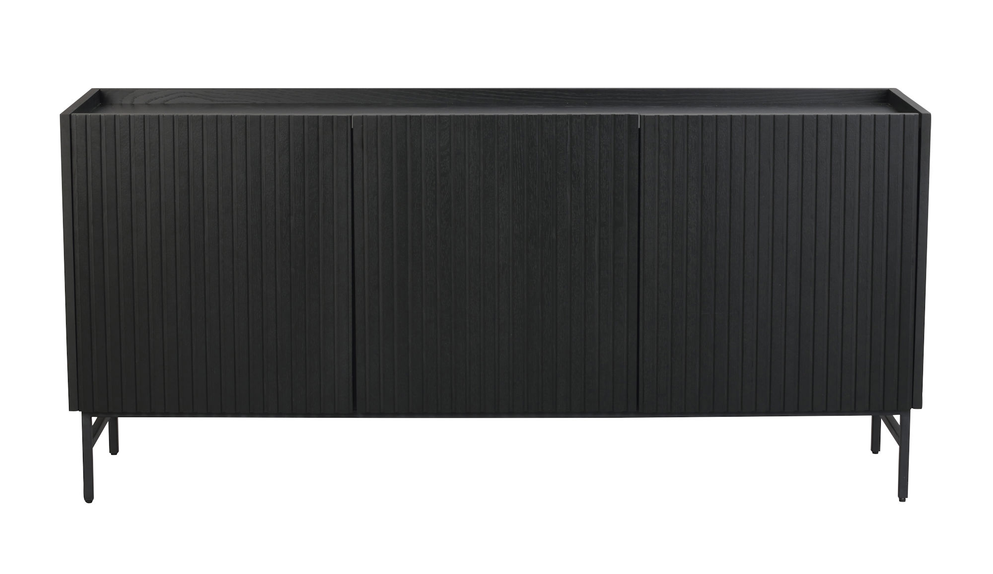 Trendiga Halifax sideboard i svartlackad ek med svarta metallben i rak elegant profil. Ytan består av massiva ekribbor på faner. Knoppar i guldfärgad borstad metall medföljer och du väljer själv om du vill sätta dit dem eller ha utan, Dörrarna har mjukstängande soft-close funktion och innanför finns flyttbara hyllplan.
