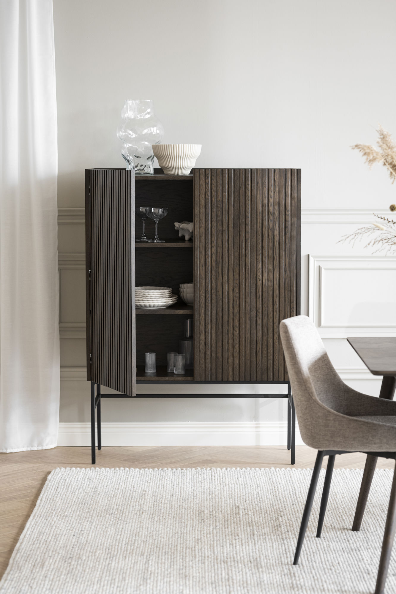 Trendiga Halifax skåp i brunlackad ek med svarta metallben i rak elegant profil. Ytan består av massiva ekribbor på faner och har två praktiska hyllplan, varav ett är justerbart. Knoppar i guldfärgad borstad metall medföljer och du väljer själv om du vill sätta dit dem eller ha utan. Dörrarna har mjukstängande soft-close funktion.