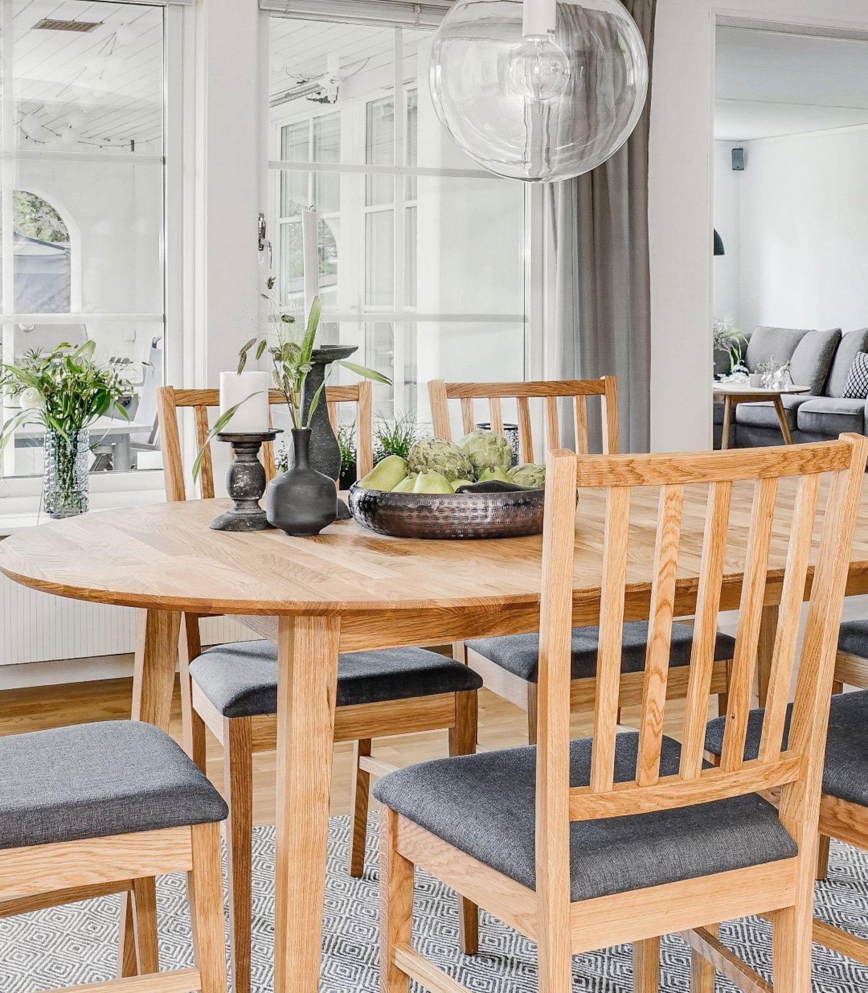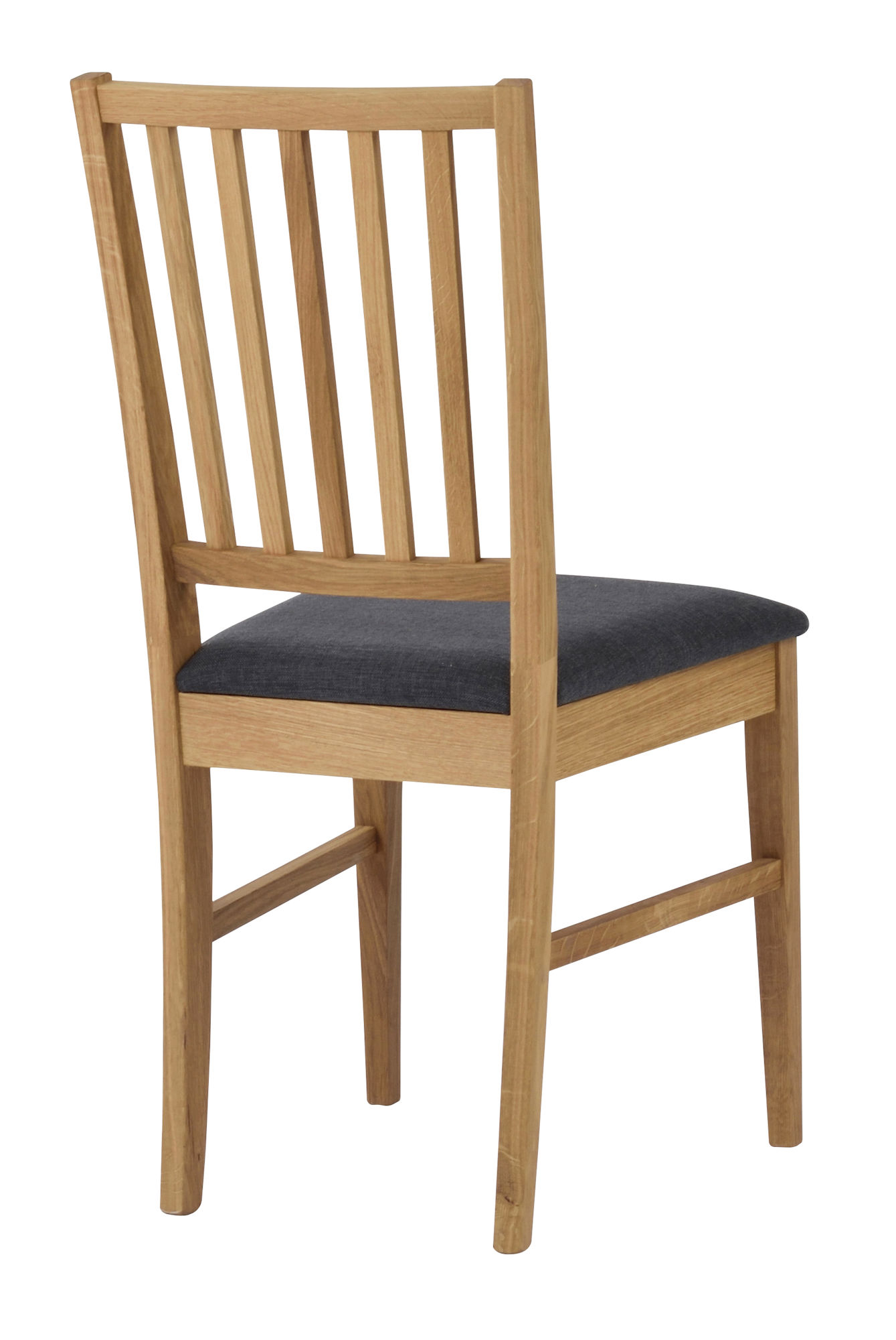 Trästol i tidlös och skandinavisk design. Stolen är i oljad ek med dekorativ stoppad sits med grått tyg. Levereras monterad. Stolen ingår i serien Filippa.