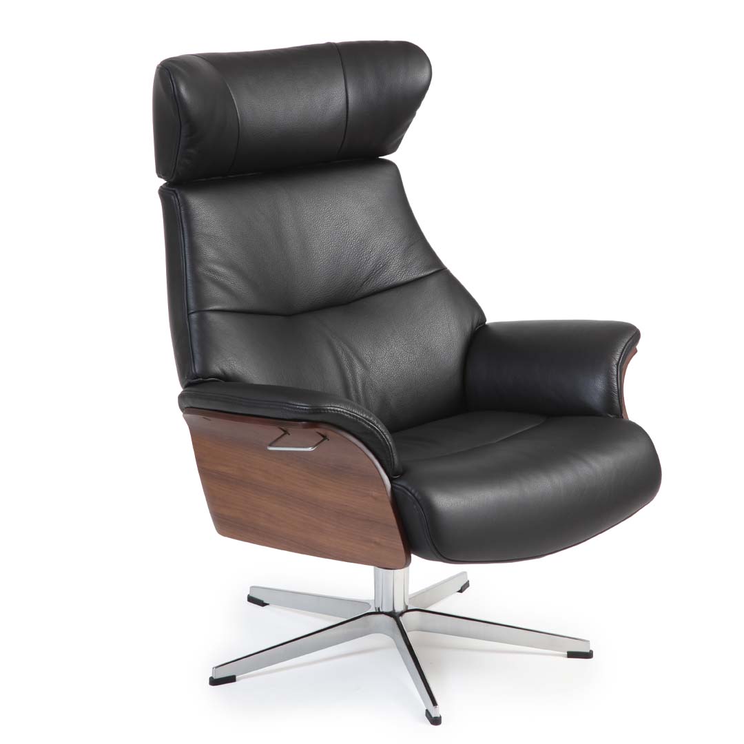Fåtölj Air med snurrfunktion och ställbar rygg. En riktigt bekväm fåtölj i en tidlös design. Här klädd i skinn Fantasy svart med balja i valnötsfanér och snurrfot i formgjuten aluminium.