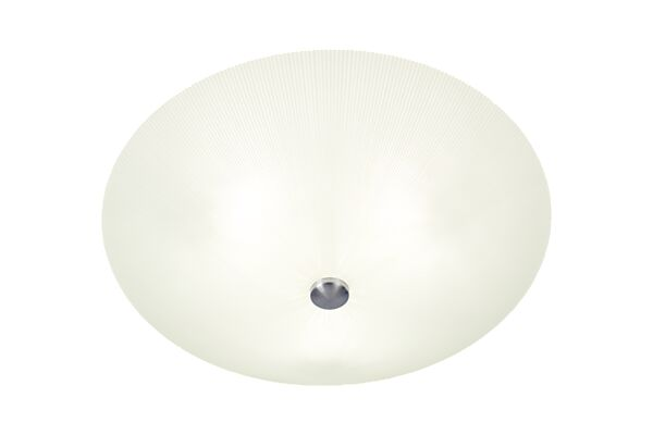 Stråla plafond med lätt skålformat mönstrat glas och detaljer i metall. Lampan monteras i taket med krokupphäng och kopplingplint, lamppropp kan enkelt monteras.