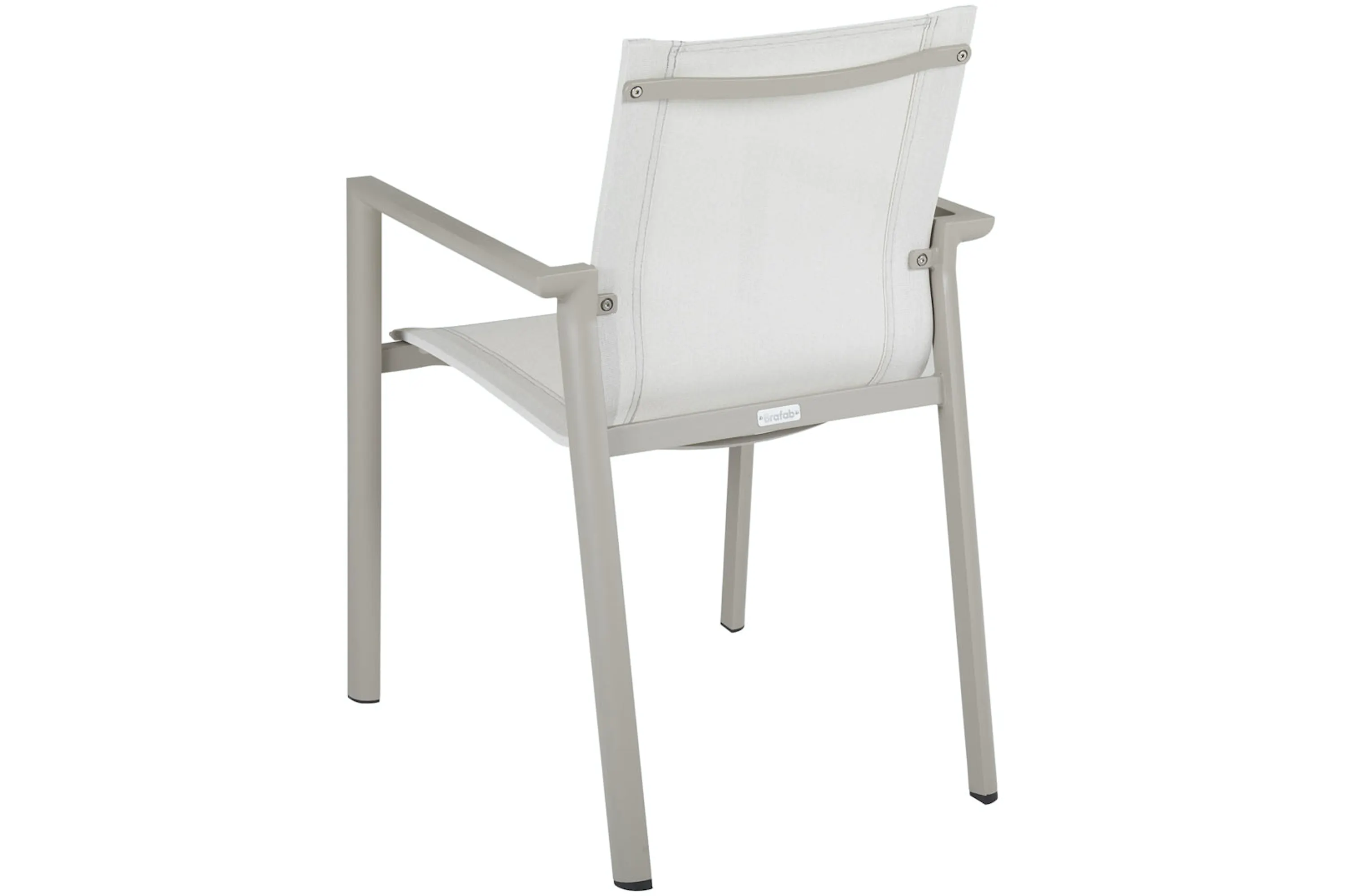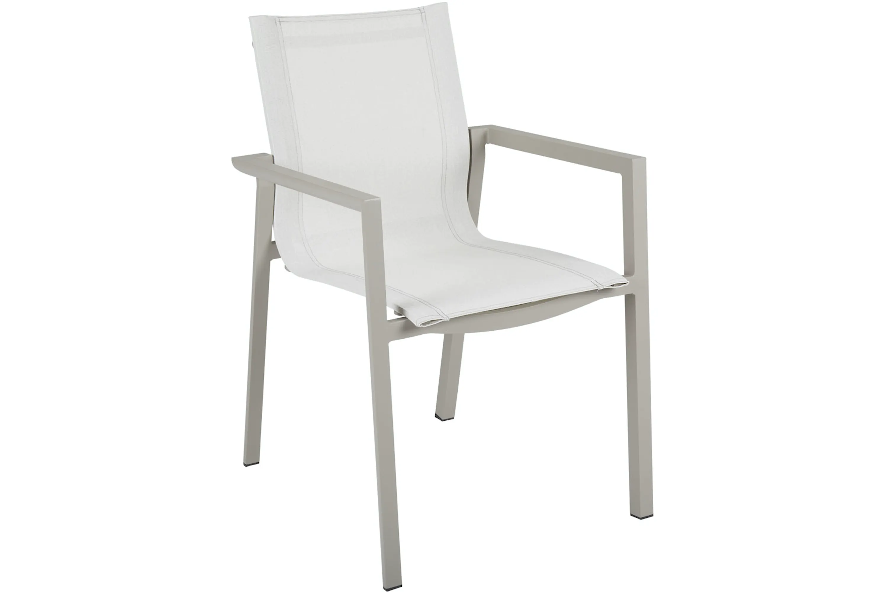 Karmstol Delia, en modern, lättplacerad stol med arm. I mattlackerad aluminium med sits i vit textilene. Stolen är stapelbar och därmed smidig att förvara. Från Brafab.