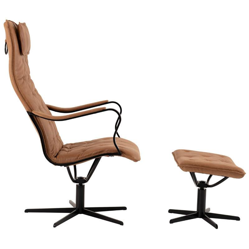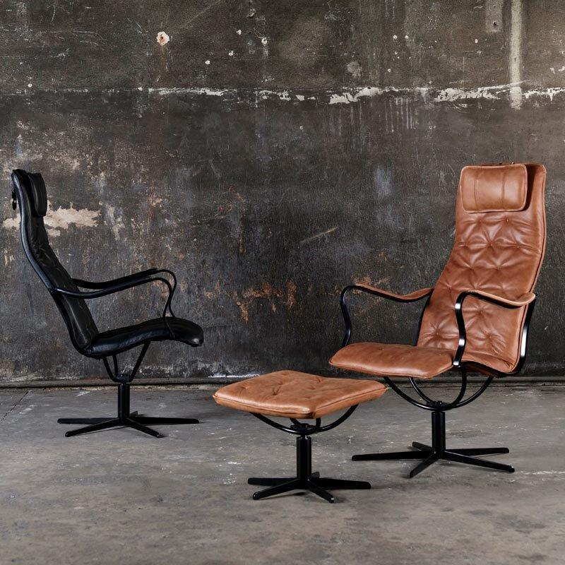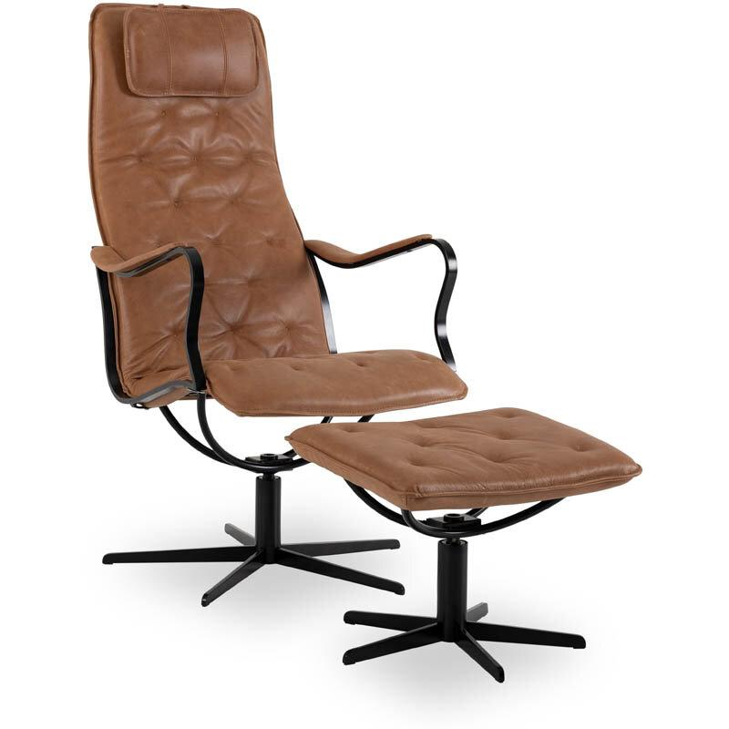 Chic fåtölj och fotpall från småländska Bröderna Anderssons. En mycket elegant och nätt fåtölj med mycket god sittkomfort, i en tidlös svensk design. Fåtöljen har skön snurr- och gungfunktion som enkelt kan låsas i önskat läge. Chic fåtölj i läder är snyggt pikerad i sits,- och ryggdelen. Nackkudden och armstödsdetaljerna är i läder. Underredet är tillverkat i svartlackad metall. Modellen finns även att beställa i fårskinn.