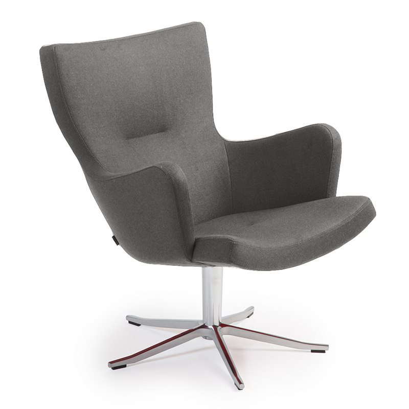 Gyro är en nätt och elegant snurrfåtölj med en bra sittkomfort. Underredet i formgjuten aluminum har ett minne som gör att den alltid stannar på samma ställe. Här med armstöd klädd i tyget Mariam, i butiken med snurrfot i svart aluminium. Kan även fås i krom.