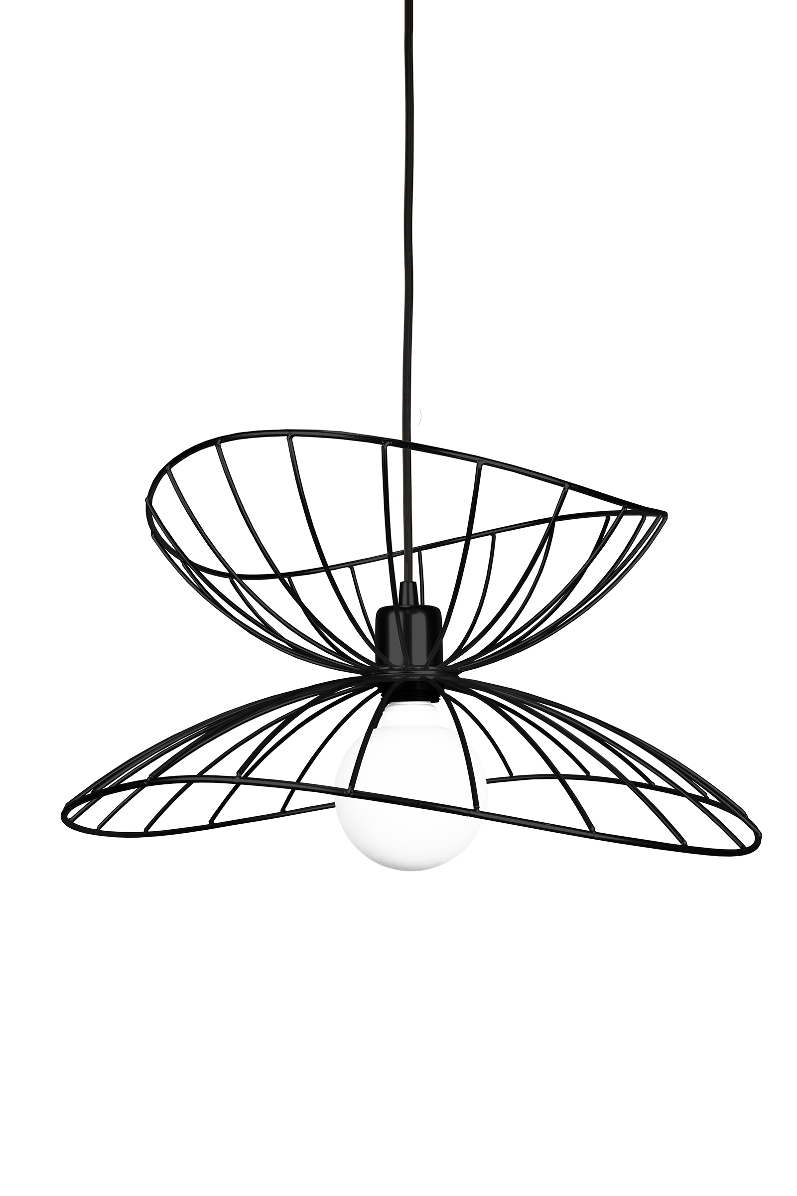 Denna ”Ray”-pendel är 45 cm i diameter för de som önskar en nättare variant av denna lampa. Den har samma konstruktion som den större modellen, vilket gör att den kan kombineras på fyra olika sätt beroende på hur skärmarna monteras. Denna är i Svart Metall och har Svart textilkabel som är 120 cm lång.