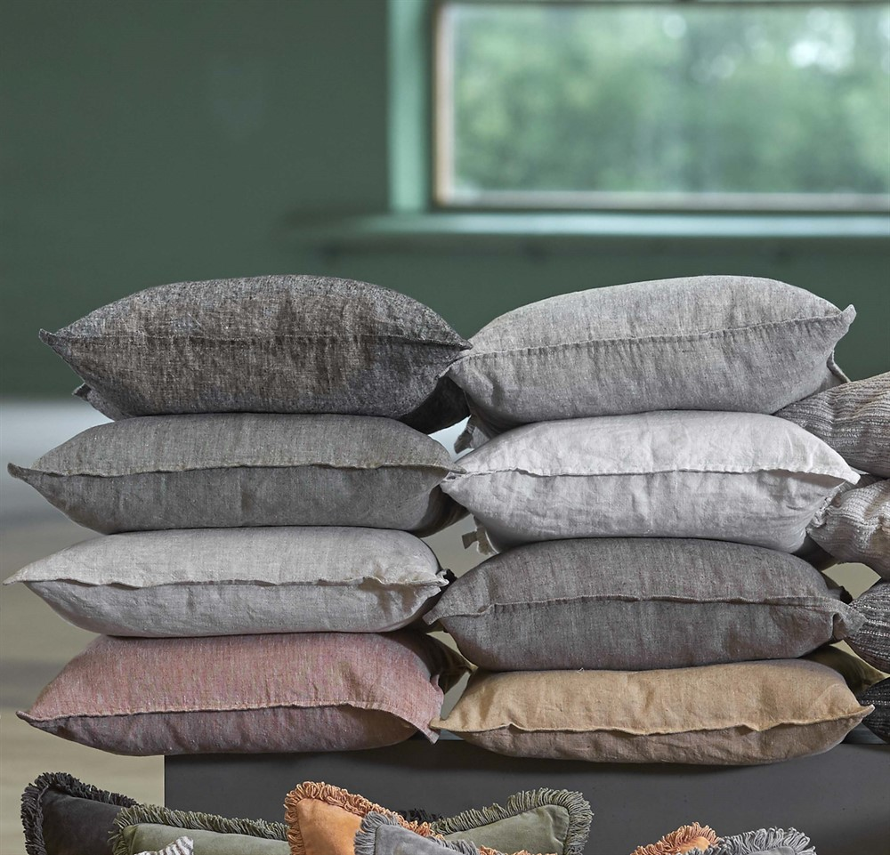 Millie, stilrent kuddfodral i tvättat linnetyg – här i en härlig grön nyans. Kuddfodralet har en dekorativ sydd vinge runt om och en dold dragkedja i nerkant.