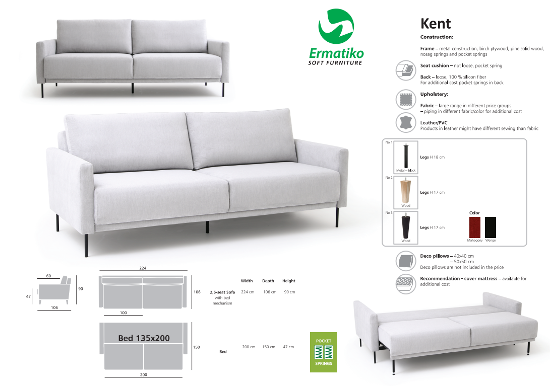 Kent bäddsoffa är en stilren men framförallt bekväm soffa. Med pocketfjädrar i sits som ger en skön både sitt- och liggkomfort. Enkel att bädda upp och ger en bädd som är hela 150x200 cm. Komplettera gärna med en tunn bäddmadrass. Soffan finns att beställa i flera olika färger i tyg eller läder.