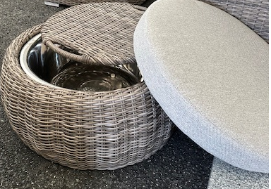 Sidobord/pall i konstrotting med dyna. I botdet/pallen ryms en ishink för svalka i varma sstunder.