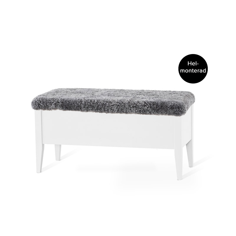 Välj mellan olika klädslar på toppen – grå fårskinnsimitation, äkta fårskinn, ljusgråa tyget Chelsea eller bruna tyget Abriamo. På insidan av bänken finns ett rymligt fack med en praktisk skiljevägg, som även går att tas bort för att göra plats för större föremål.