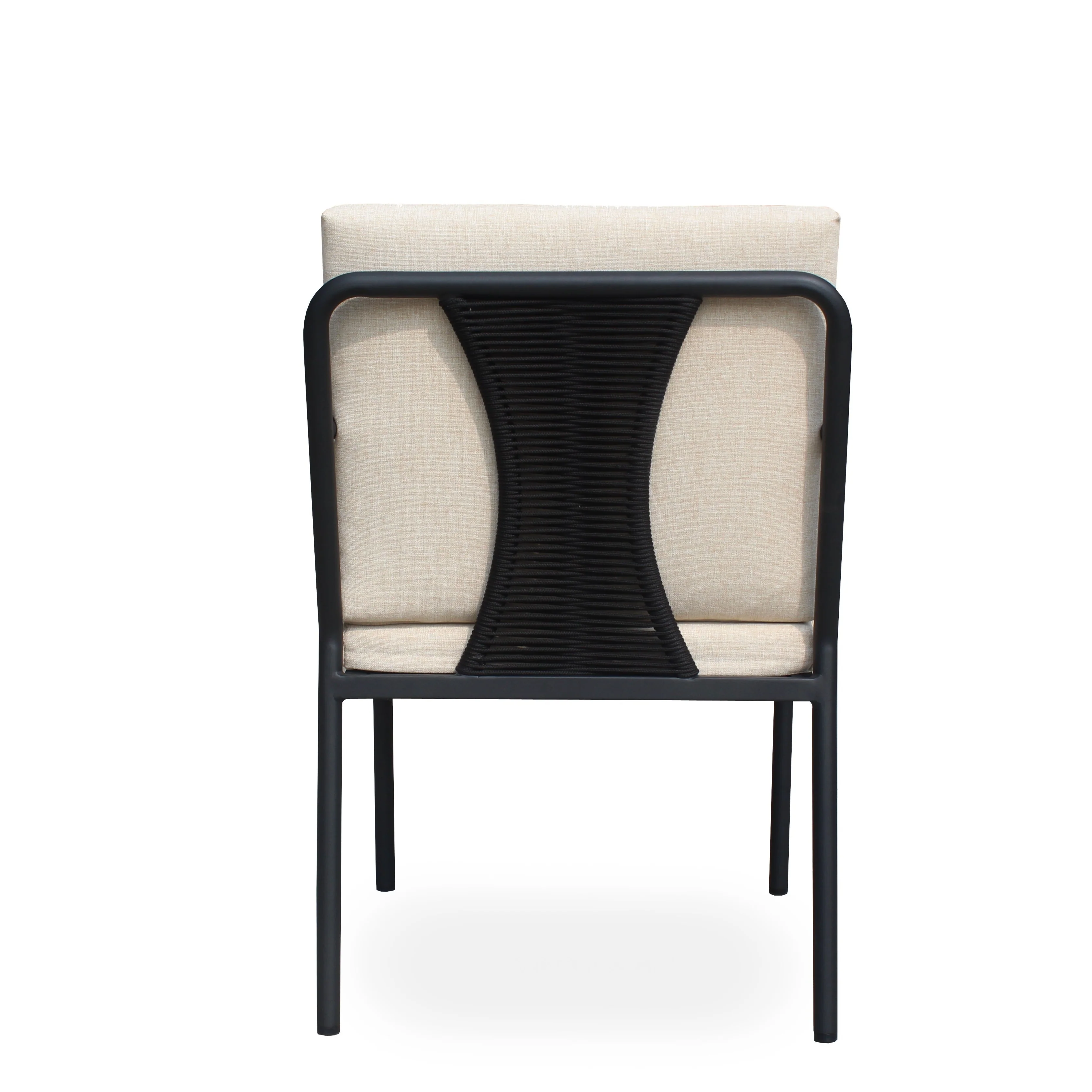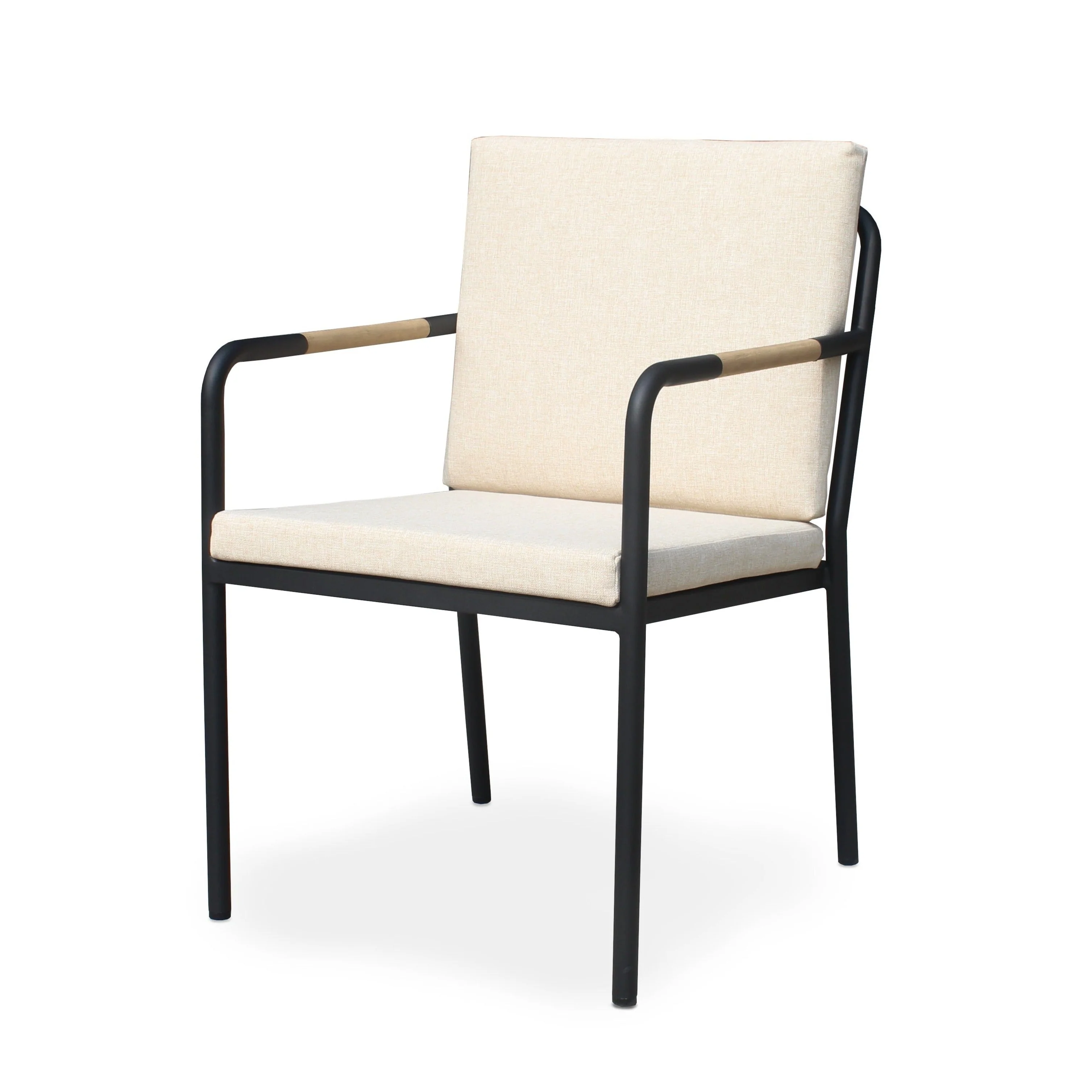 Höllviken karmstol i svart aluminium med rep och inläggav teak i armstöden. Stolen kommer med både sits- och ryggdyna i beige.